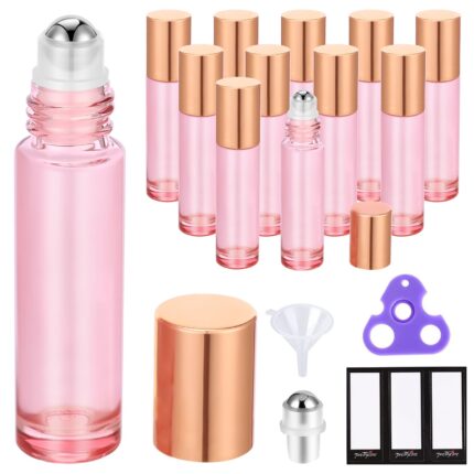 PrettyCare 12 Pack, 10 ml Essential Oil Roller Bottles with Stainless Steel Roller Ball – Refillable Leak-proof Empty Thick Pink Glass Roll on Bottles with Metal Caps for Travel, Perfume