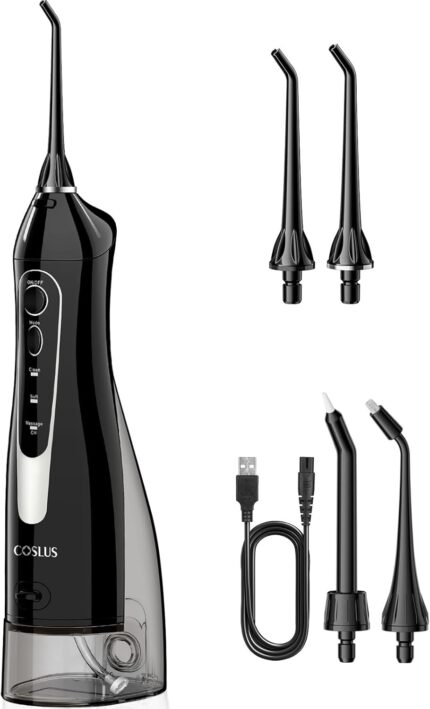 COSLUS Water Flosser Dental Pick: 300ML Oral Irrigator for Teeth Cleaning, Orthodontic, Braces & Sensitive Gums, Cordless Portable for Travel, IPX7 Waterproof, for Adults Teens Family Use, with 4 Tips