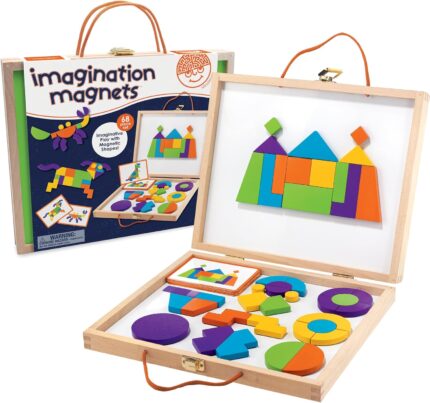 MindWare Imagination Magnets Wooden Pattern Blocks Set – Imaginative Play with magentic Shapes in a Carrying case – 42 Magnetic Solid Wooden Blocks, 50 Full-Color Laminated Puzzles