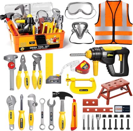 Deejoy Tool Set with Tool Box & Electronic Toy Drill, Pretend Play Kids Construction Kits for Kids Ages 3-5 Years Old, Toddler Boy Toys(Orange)