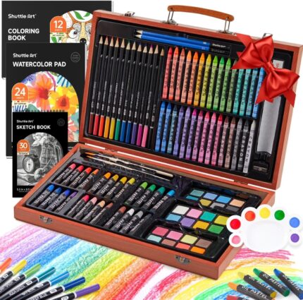 Shuttle Art 106 Piece Deluxe Art Set, Art Supplies in Wooden Case, Painting Drawing Art Kit with Crayons Colored Pencils Oil Pastels Watercolor Cakes Coloring Book Sketch Pad for Kids Adults
