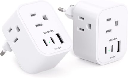 【2-Pack】 European Travel Plug Adapter, BESHON International Power Plug Adapter with 3 Outlets 3 USB Ports(2 USB C), Type C Plug Adapter Travel Essentials to Most Europe Spain Italy France Germany