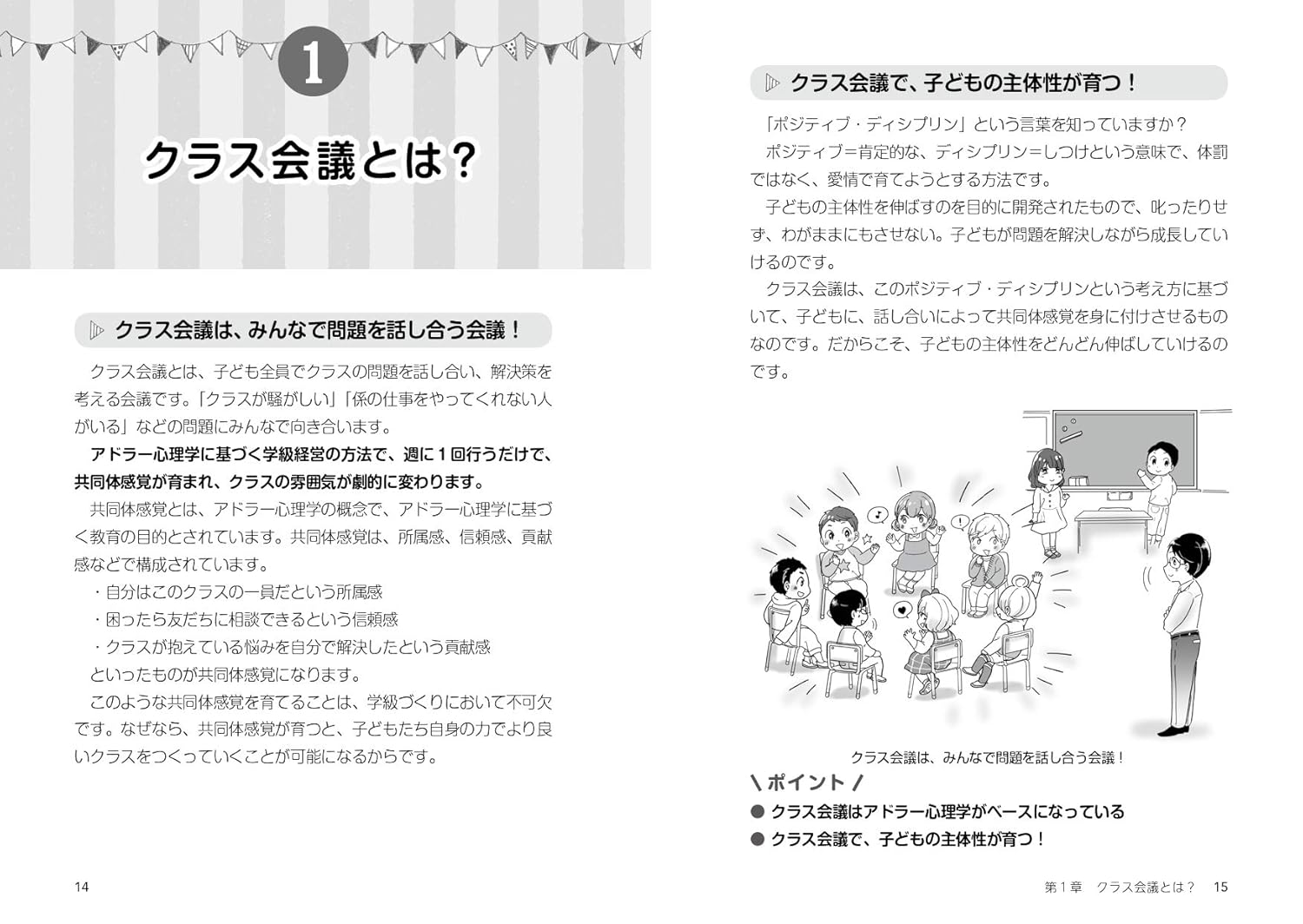いまSNSで大注目のたいち先生による初の単著!クラス会議を取り入れれば、子どもが主体的になり、クラスがまとまるようになる!「クラスが騒がしい」「男子が下品なことを言う」「給食の量が少ない」「友だちに消しゴムをちぎられた」「自分の好きな人と同じ班になりたい」「係の仕事をやってくれない人がいる」「電車の話ばかりする友だちと話したくない」「母親がスマホを買ってくれない」「弟がゲームを壊す」など、クラスには問題や子どもの悩みがいっぱい!こうした問題をすべて子どもの対話で話し合えるのがクラス会議!本書は、クラス会議が成功するための準備や秘訣、実践事例をまとめた一冊です。