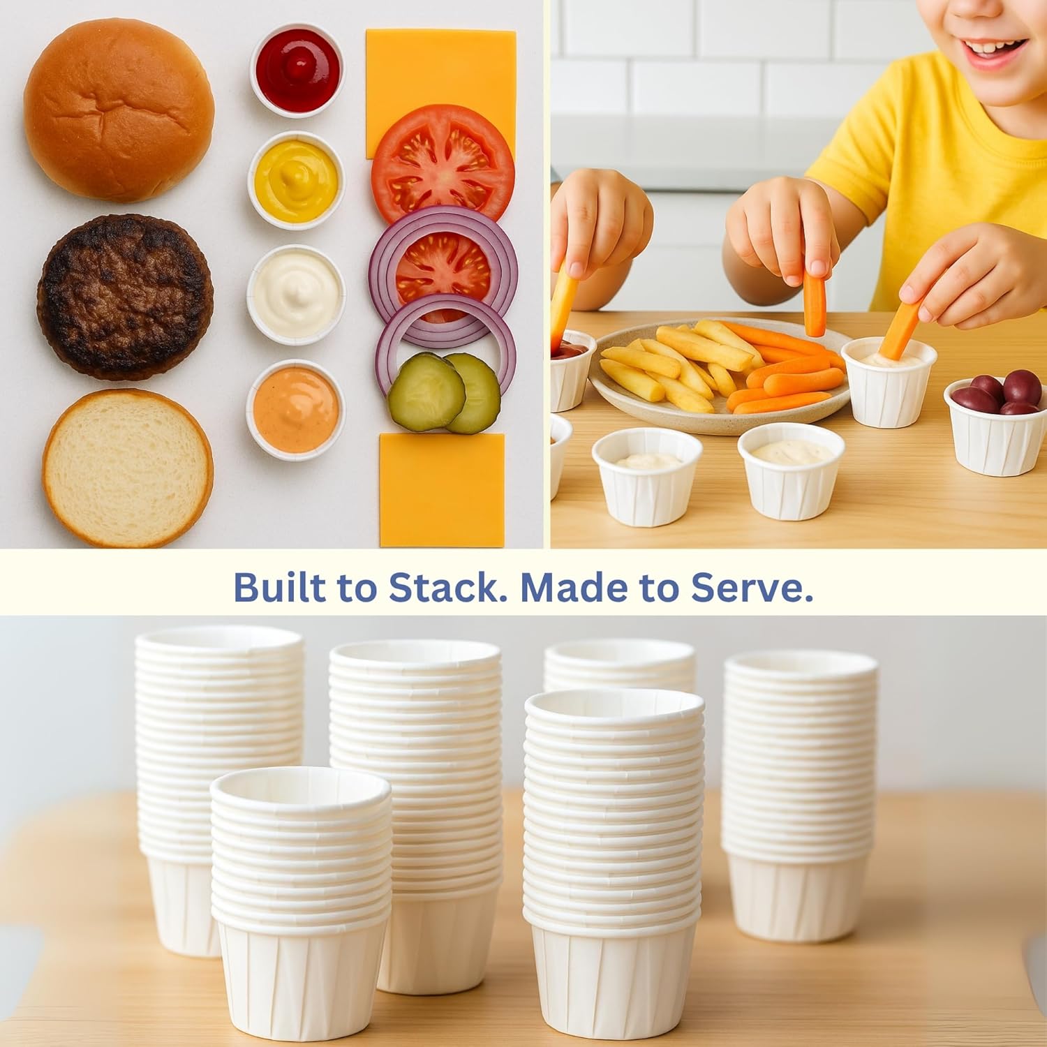 Ideal for Sauces & Sides: Perfect for dipping sauce cups or paper condiment cups, these 1 oz paper cups are ideal for serving ketchup, mustard, mayo, and dressings at parties, restaurants, or home use—no mess, just convenience.
