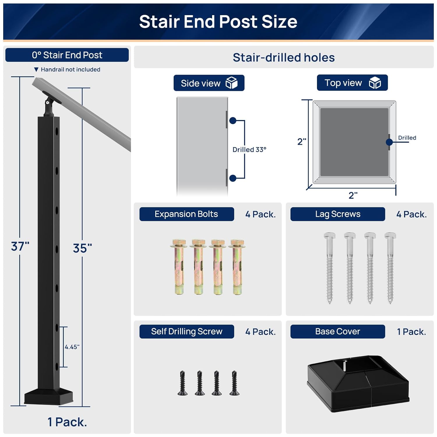 1 Pack 35″x3″x3″ Horizontal Aluminum Stair Railing Post, Stair End Post, Black Textured Powder-Coat Finish Horizontal Rail System for Outdoor Decks, Porches & Balconies