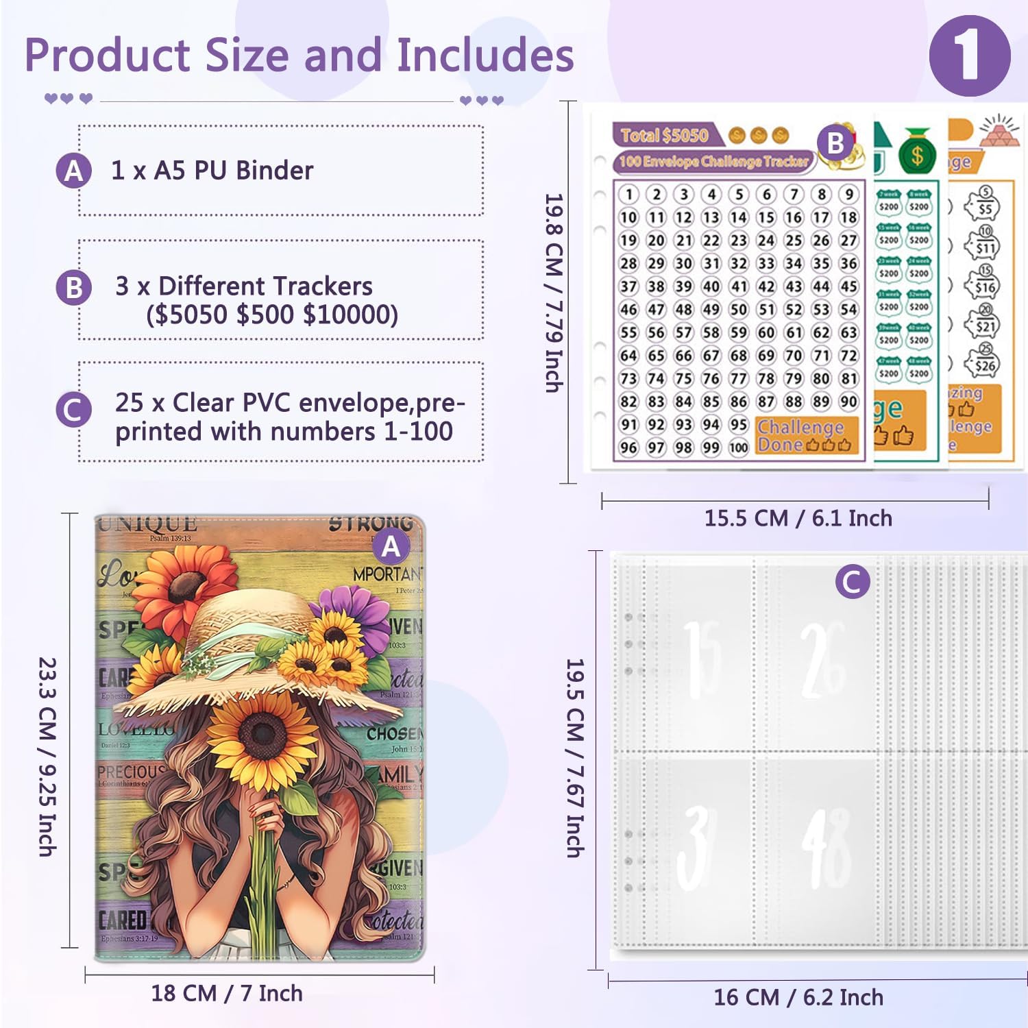 💰【100 Envelopes Challenge Kit】 1x PU leather savings challenges book with card slot, cash wallet, 3x laminated reusable savings tracker for marking – $5050, 10000, 500, 25x pages 6-hole cash envelope (4 pockets per page) with pre-printed 1-100 numbers, 2x PVC zipper bags, 1x Colorful Label Stickers, 20x Inspirational Quotes Stickers.