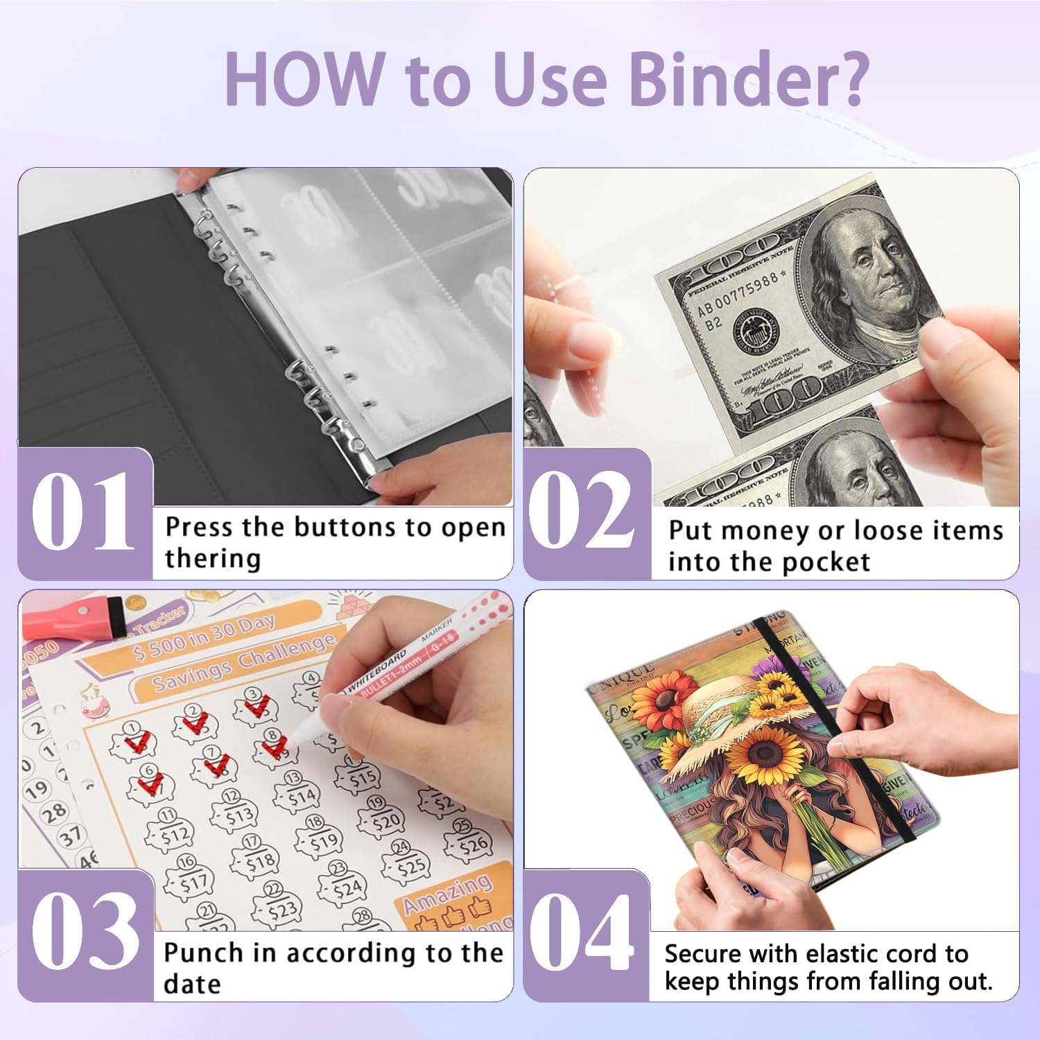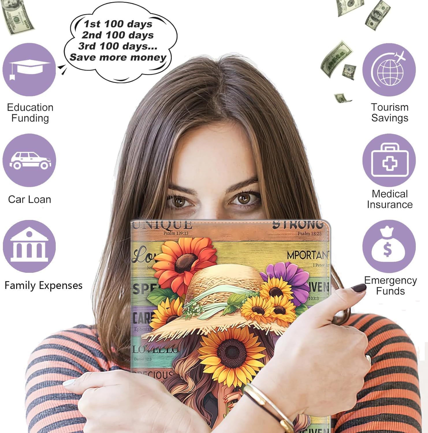 100 Envelopes Money Saving Challenge Binder, A5 Budget Binder with 25 pcs Cash Envelopes, 3 pcs Reusable Laminated Trackers Saving, Money Organizer,Black Girl African Women Girl Sunflower