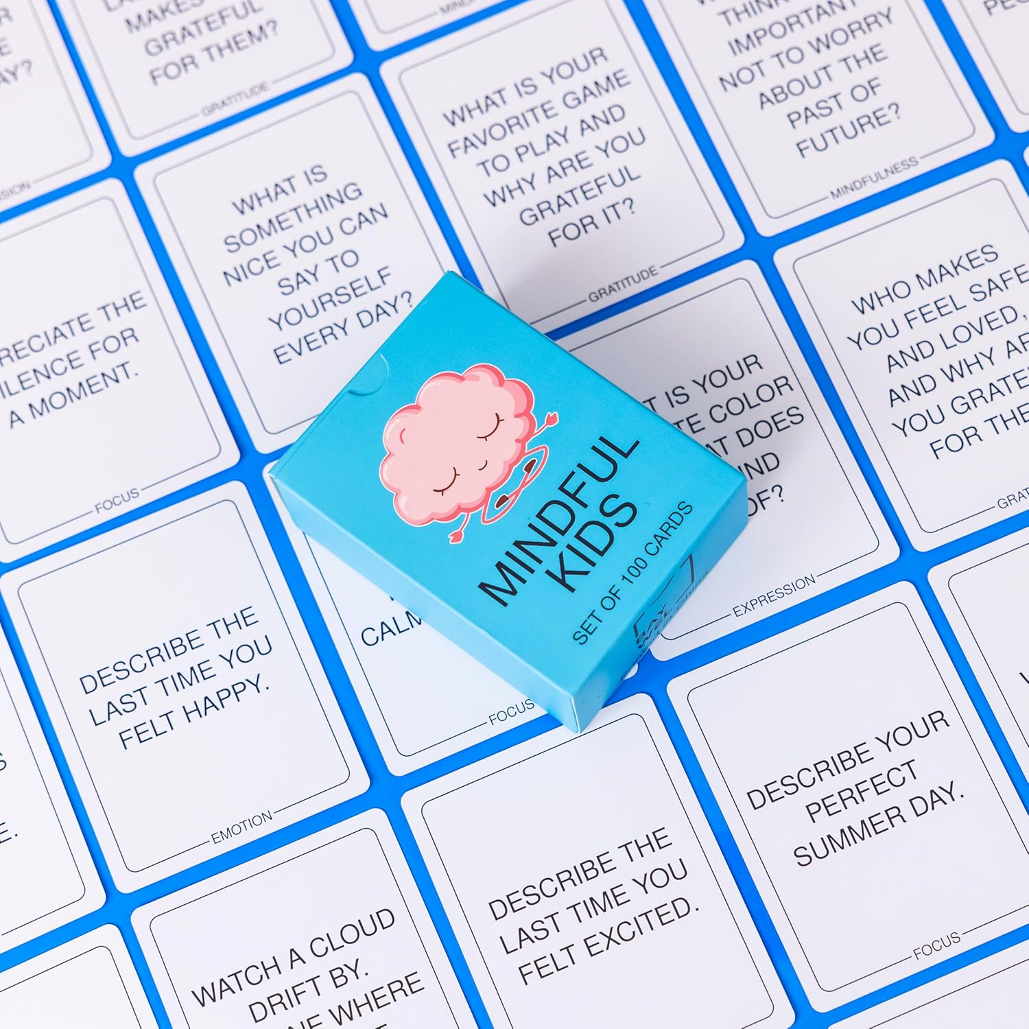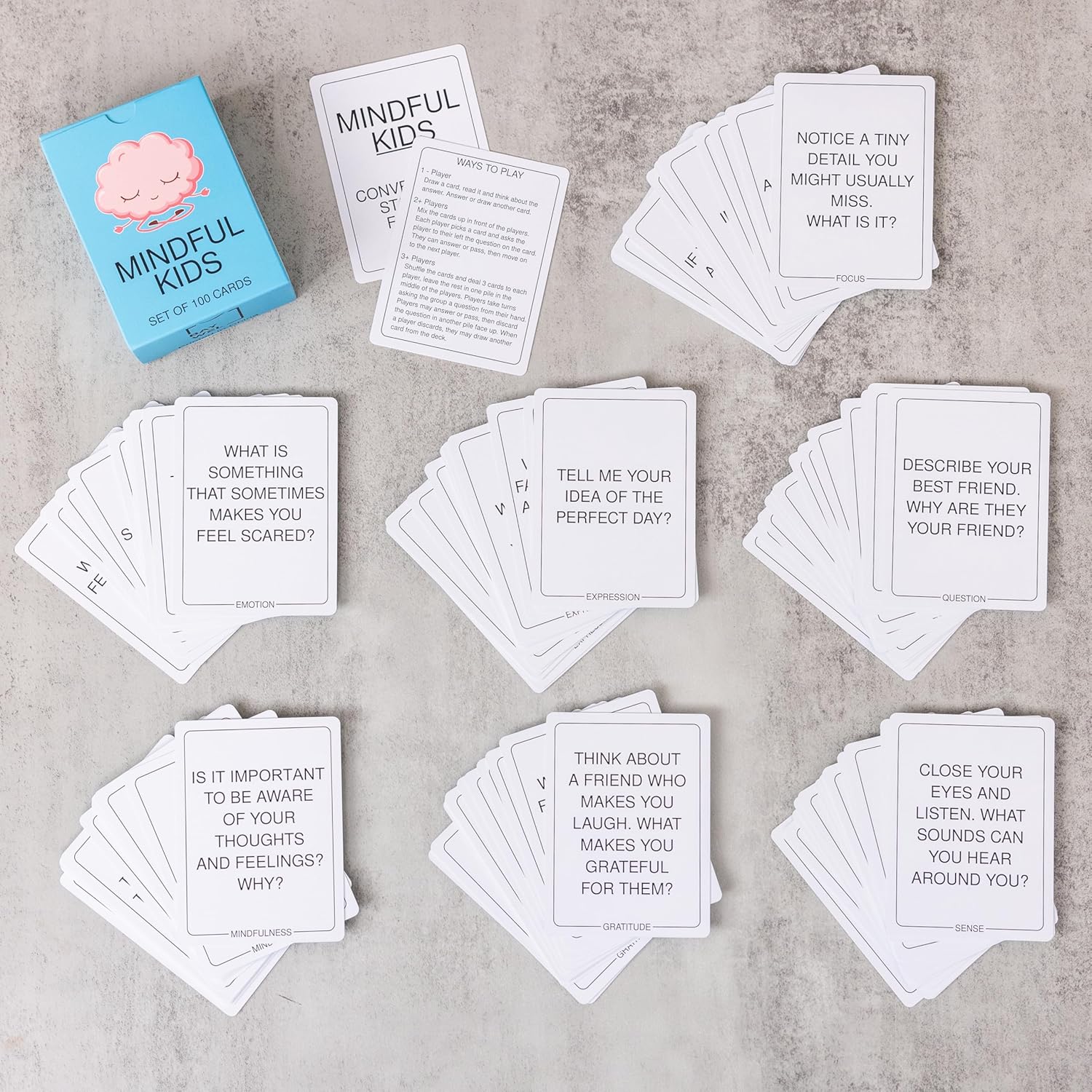 SET OF 100 CARDS – Set contains 98 Prompt Cards and 2 Instruction Cards. Cards are dividend into 7 Categories (Focus, Expression, Emotion, Sense, Mindfulness, Question, & Gratitude) PROMOTES SELF CARE – Instructions for simple to learn gameplay to promote self-care and meaningful conversation with children. Cards can be used as family table topics, 1-on-1, or with groups up to 6. LARGER DIMENSIONS – Larger card size with high contrast fonts are easy to read and easier to handle with smaller hands. Bright graphics are welcoming to children. HIGH QUALITY – Cards are made from high quality materials to stand up to use at home, traveling, in the classroom, or in the therapy office setting. Cards are high contrast and easy to read. INSPIRATIONAL CONVERSATION STARTERS – Cards Promote Meaningful Communication, Mindful Self Care, and Help Improve Social and Emotional Regulation and Mental Health Well Being for Kids. Ages 8+ 2-6 Players