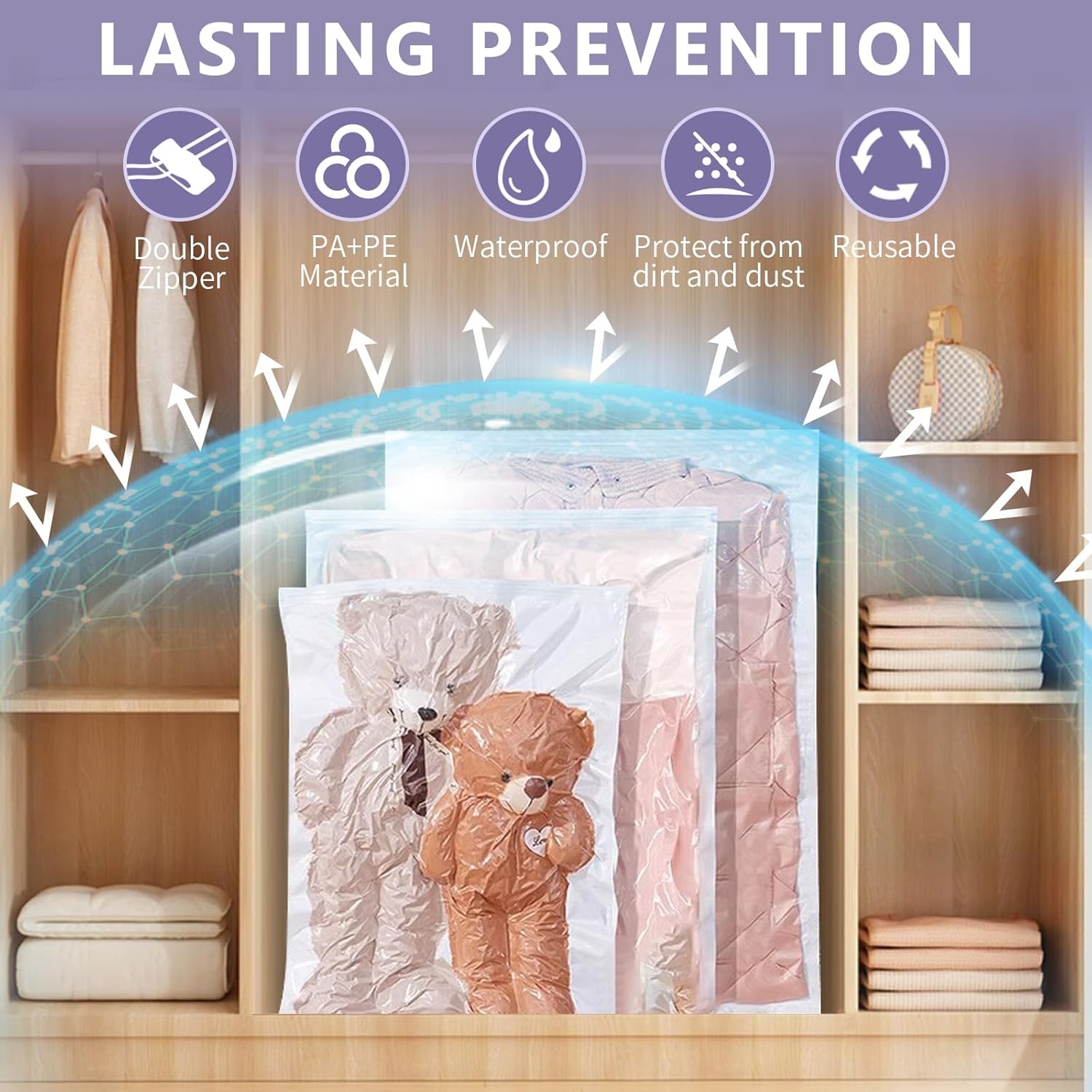SAVE TIME AND EFFORT:Using vacuum seal bags for clothing can greatly simplify the process of organizing and storing. Simply place the items to be stored in the bag and then use an electric vacuum pump or manually compress the bag to quickly pull the air out. Vacuum organizers are much easier and faster to use than traditional stacking and squeezing methods.