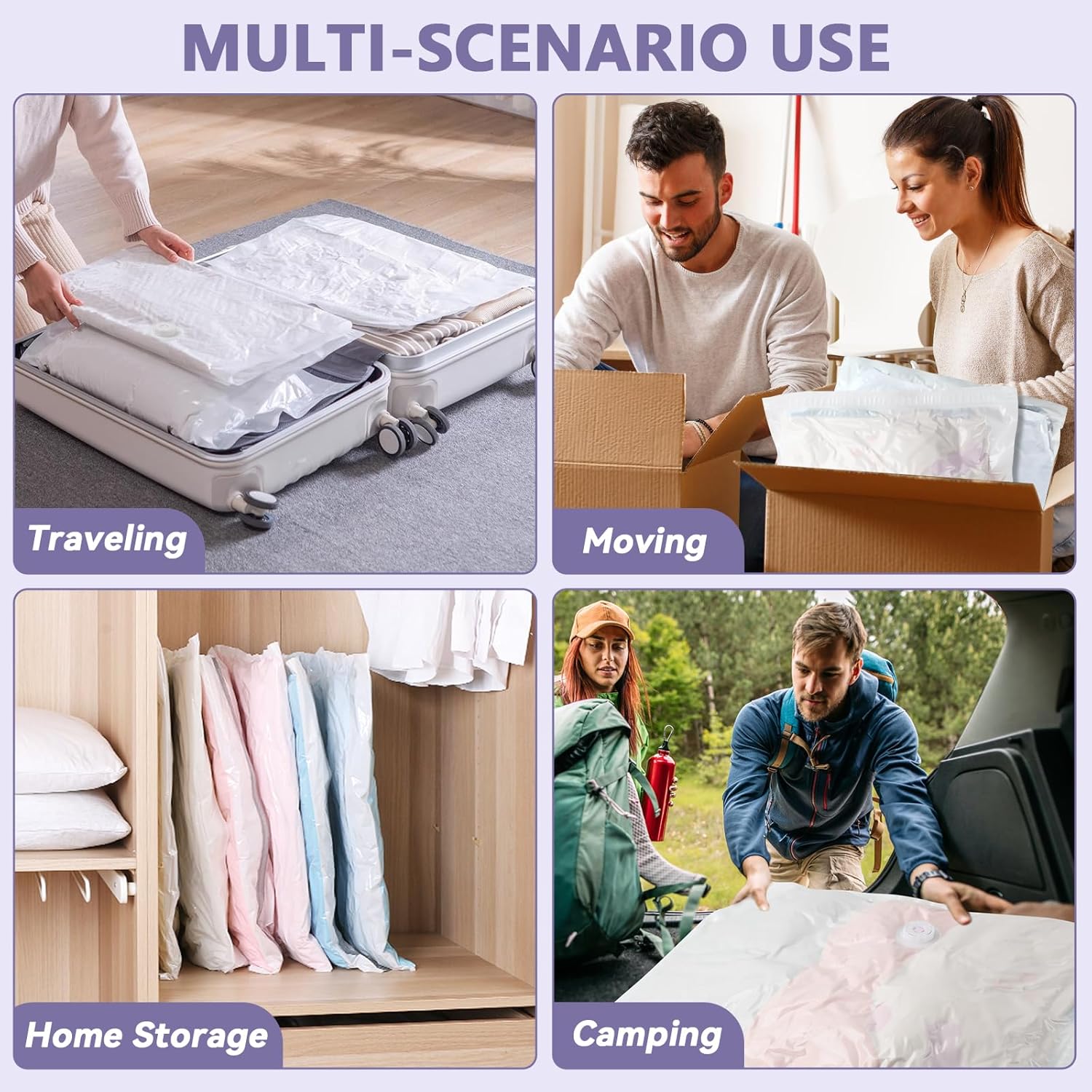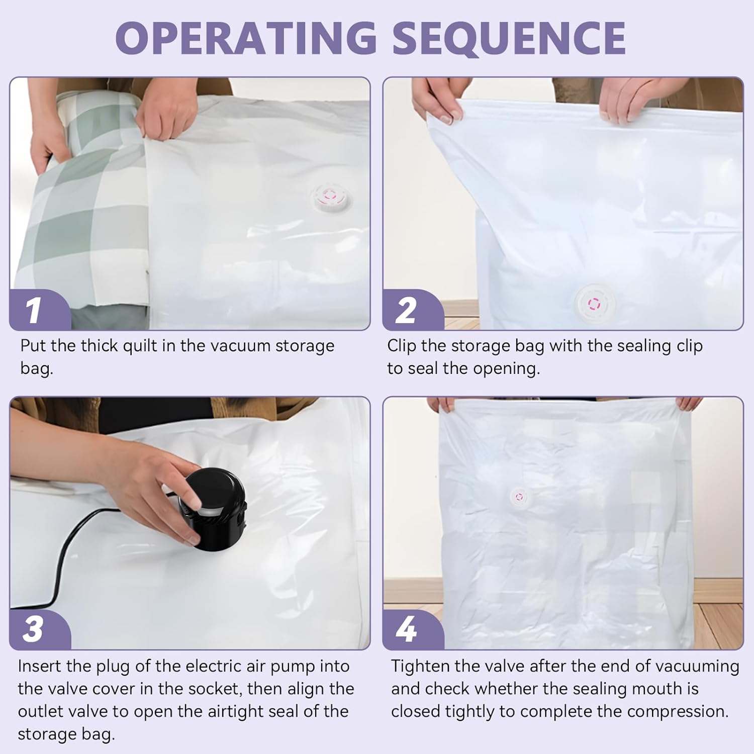 SPACE SAVING, MULTI-PURPOSE:Vacuum Storage Bags uses vacuum sealing technology to minimize the size of your items by extracting air through an electric vacuum pump. You can organize clothes, blankets, pillows and other bulky items in a limited space, providing more usable space at home or while traveling.