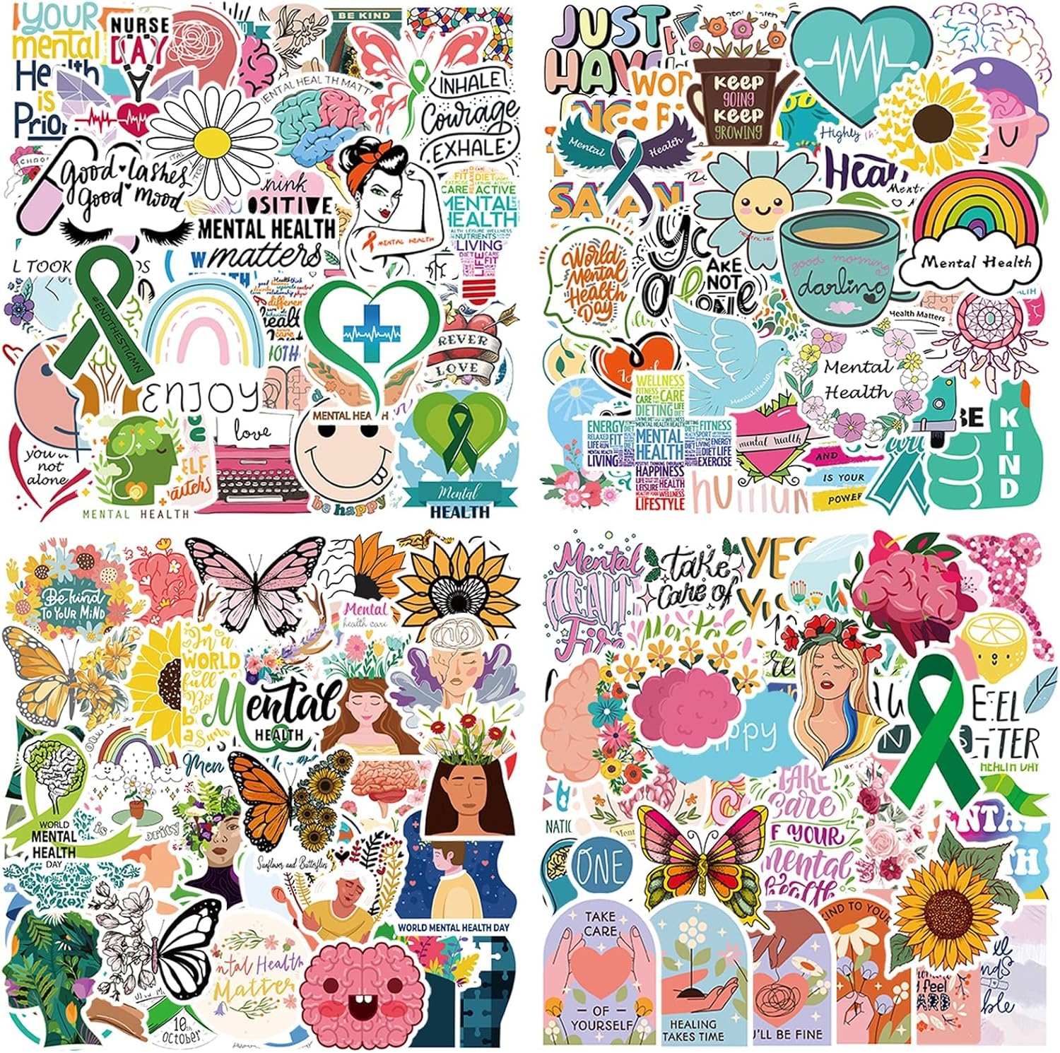 Mental Health Stickers: With 200pcs NO-repeats designs, this collection offers a wide variety of styles, from inspirational quotes like “Mental Health Matters” to calming imagery and bold patterns. Each mental health stickers is carefully designed, making them stand out as quirky mental health stickers for any occasion.