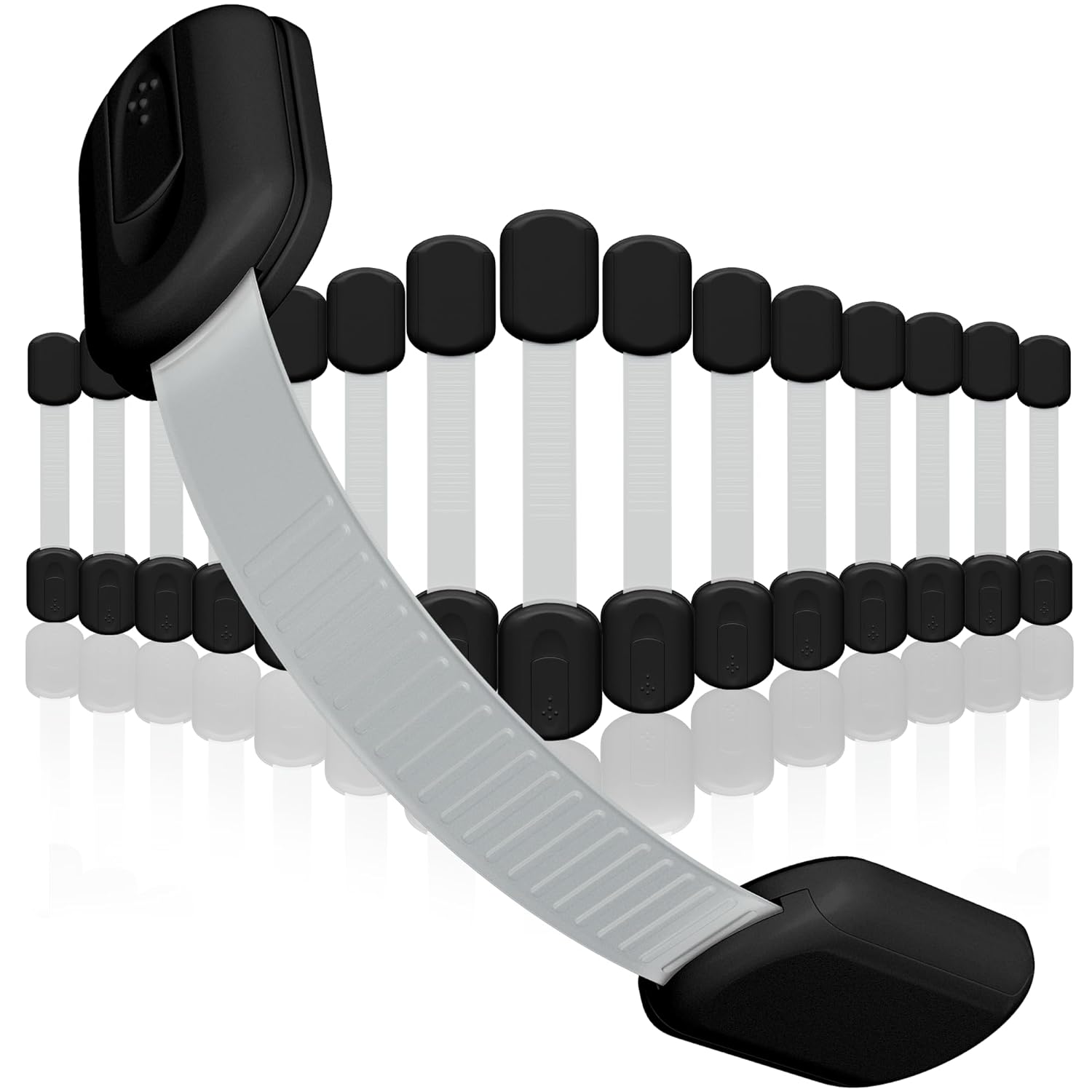 8 multi-purpose cabinet locks that has a high grade 3M adhesive. Flexible strap means you can bend around items from toilet seats to fridges