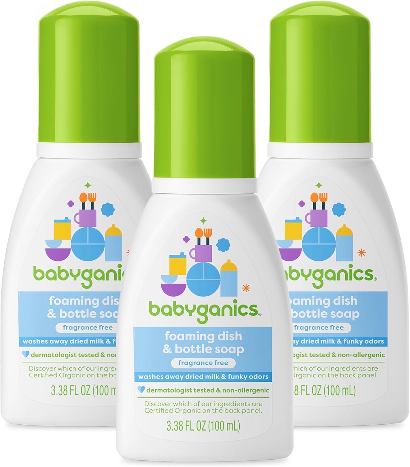 BabyGanics Foaming Dish & Bottle Soap for Travel, Fragrance Free, Removes Dried Milk, Packaging May Vary, 3.38 Fl Oz (Pack of 3)