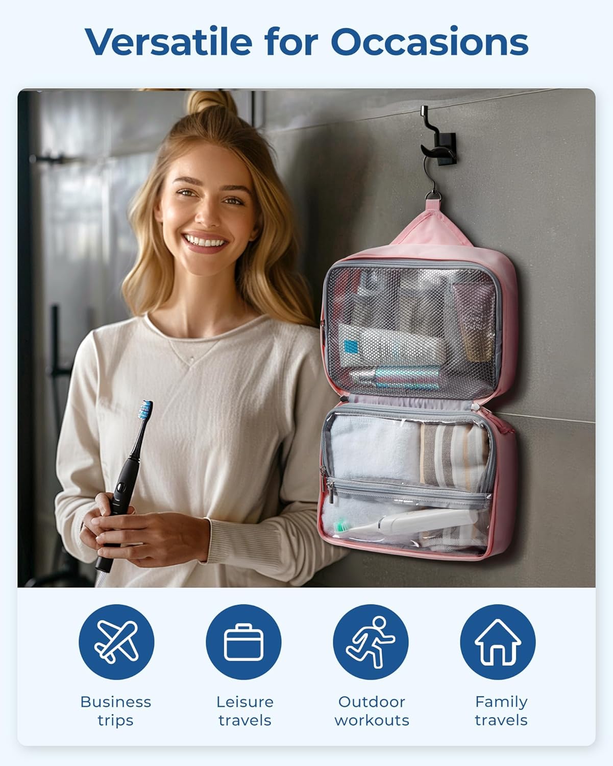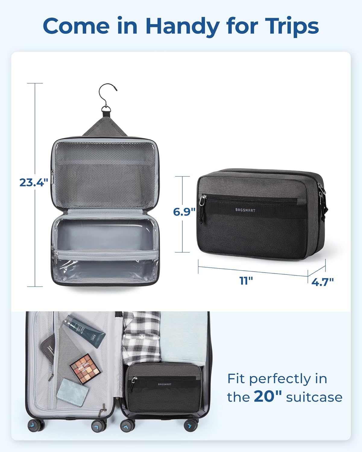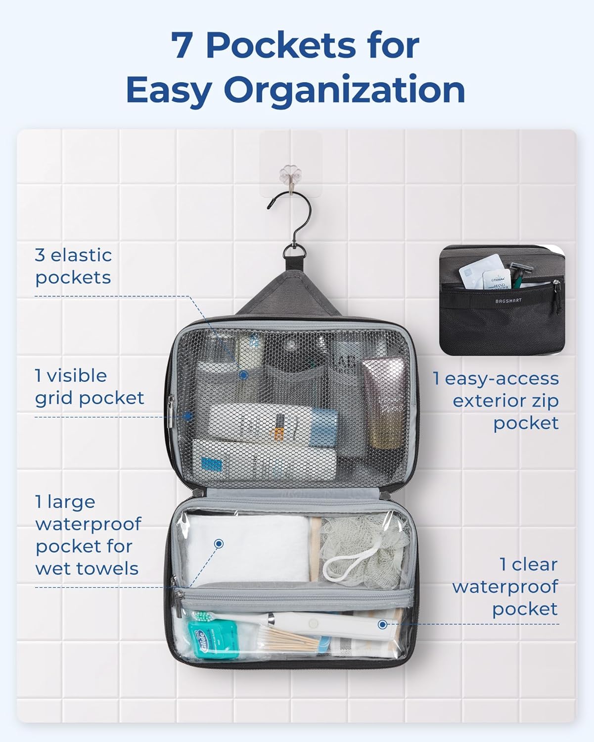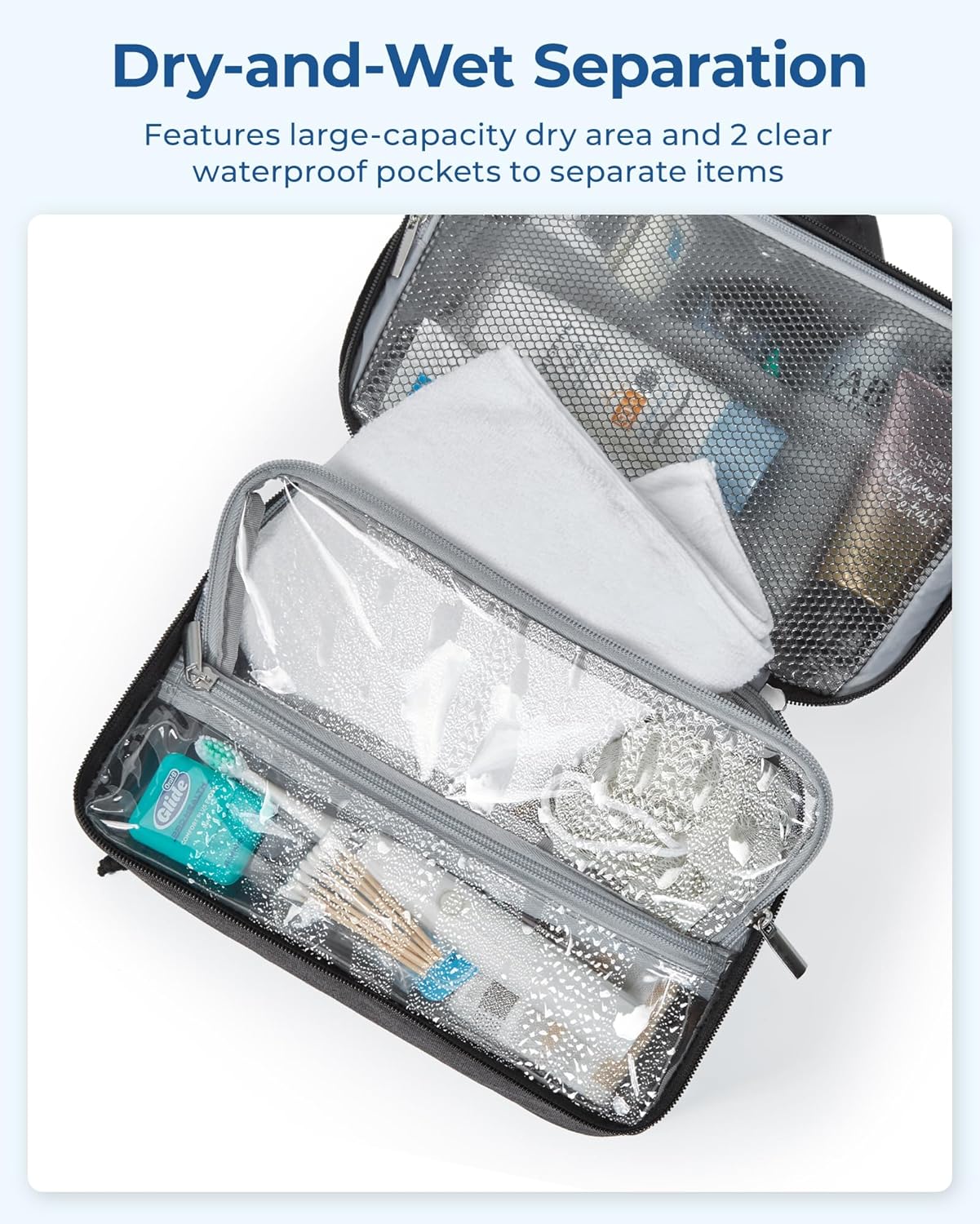 Wet-Dry Separation Design: This toiletry bag features a dual-compartment lower section for optimal organization. The spacious main compartment is perfect for wet items such as towels and bath products. A waterproof zippered pocket keeps essentials like toothbrushes and toothpaste secure. An additional external pocket offers quick access to small items like your smartphone, ID, wallet, or band-aids, ensuring convenience and efficiency