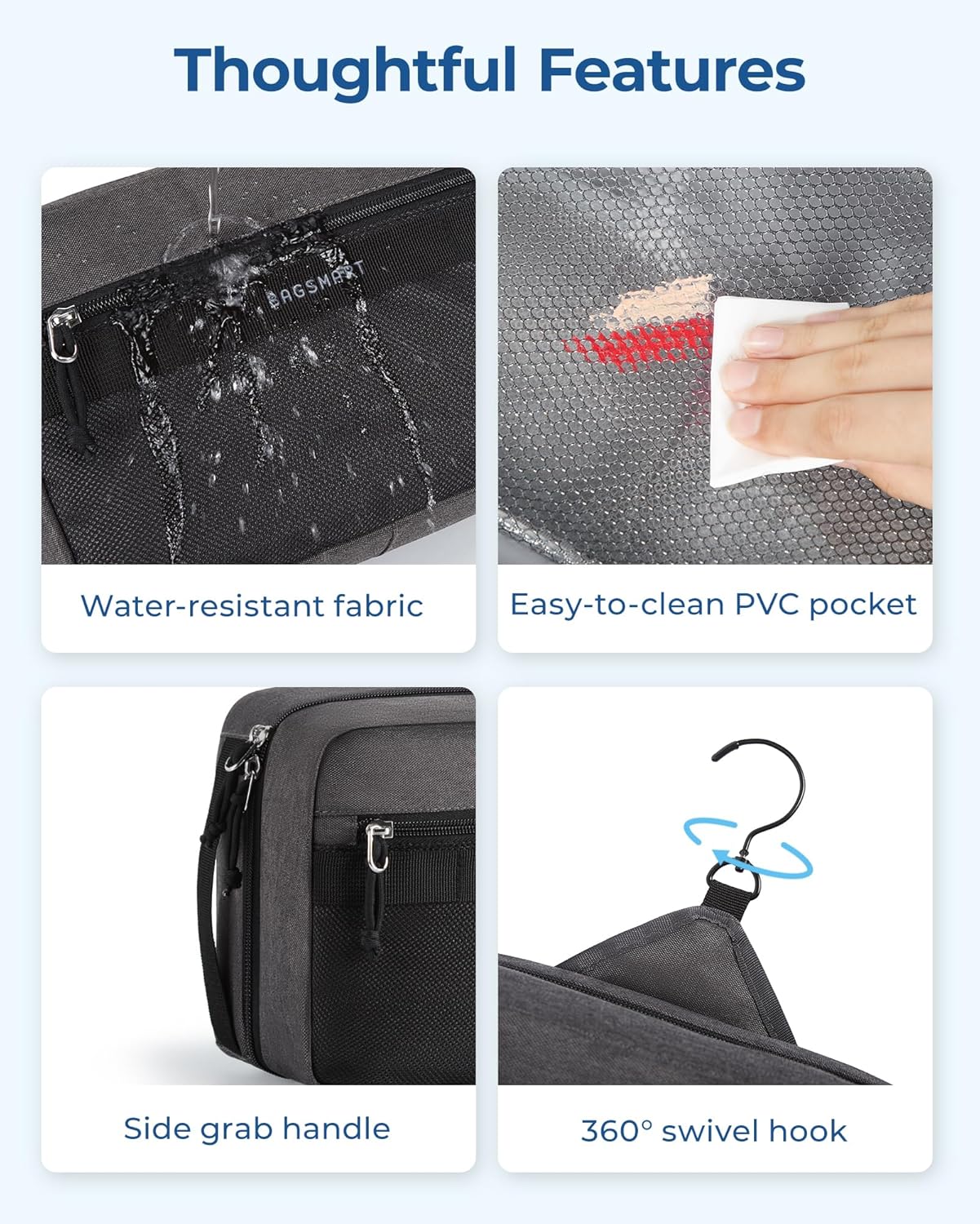 Travel Convenience: This toiletry bag boasts a 360° swivel hook for easy hanging in any setting, including bathrooms and gym lockers. Made with water-resistant fabric, it protects your essentials from moisture. The robust side handle enhances portability, making it ideal for travelers.
