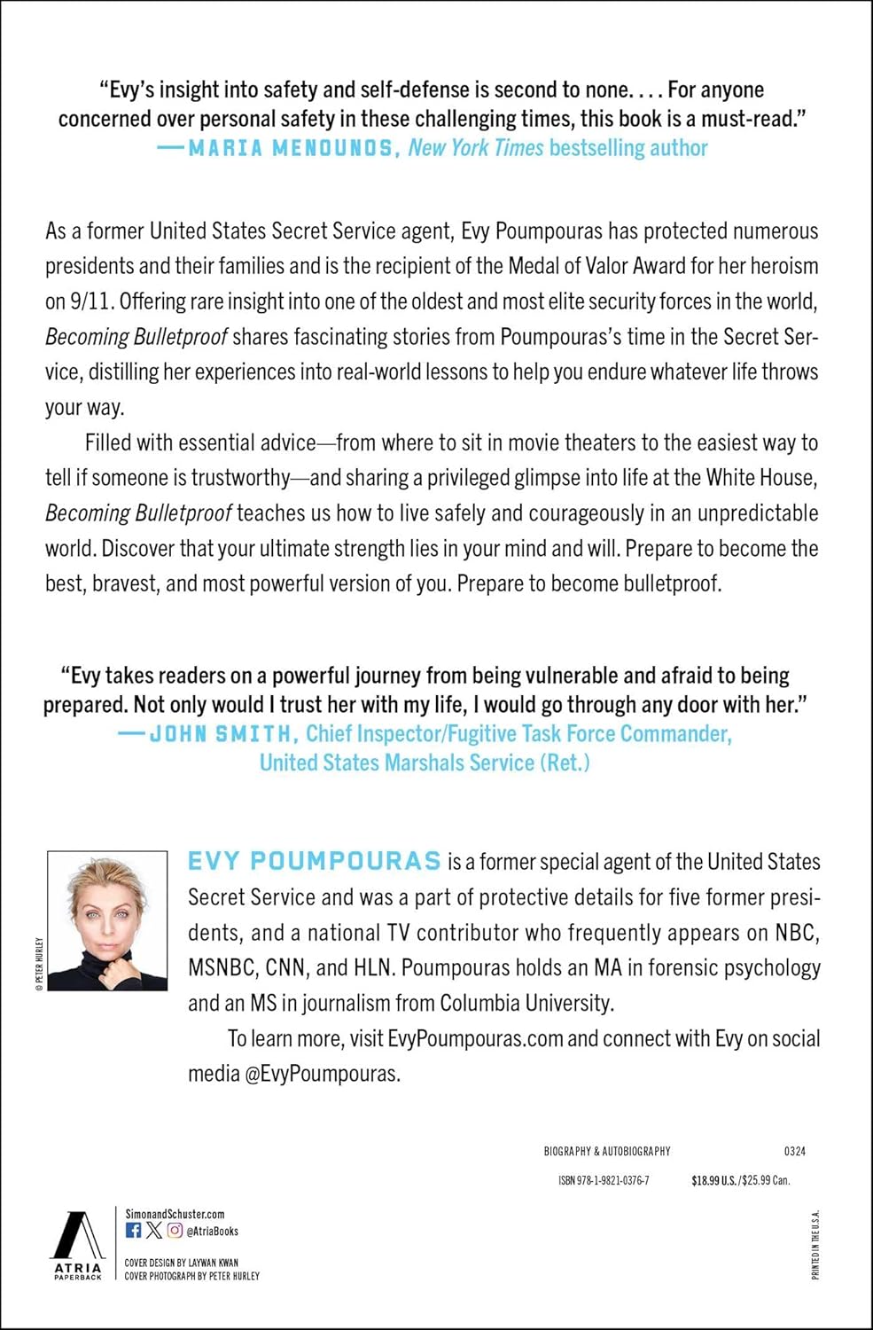 Becoming Bulletproof means transforming yourself into a stronger, more confident, and more powerful person. Evy Poumpouras—former Secret Service agent to three presidents and one of only five women to receive the Medal of Valor—demonstrates how we can overcome our everyday fears, have difficult conversations, know who to trust and who might not have our best interests at heart, influence situations, and prepare for the unexpected. When you have become bulletproof, you are your best, most courageous, and most powerful version of you. Poumpouras shows us that ultimately true strength is found in the mind, not the body.