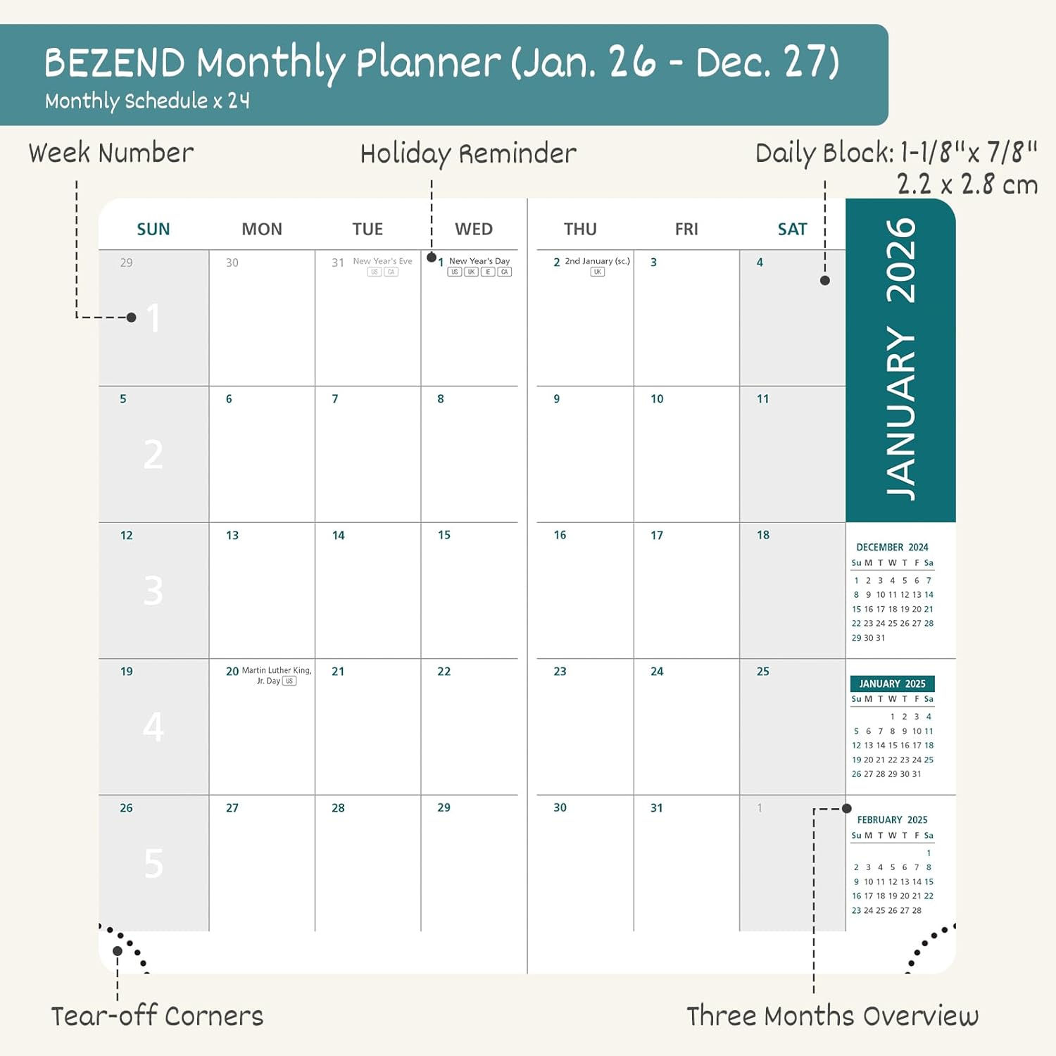 MONTHLY VIEW: on a double-page spread (no weekly view) with Major Holidays & Week number marked. Past/previous calendar reference for better past reviewing and future planning