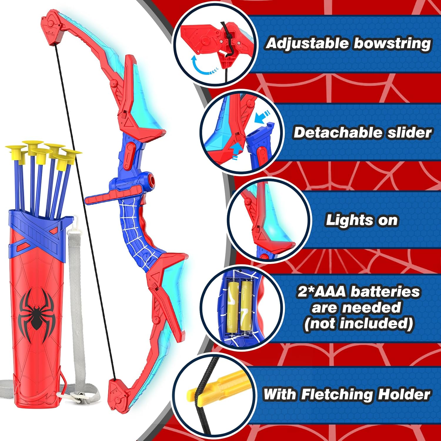 Start Aiming & Firing Right Away: This bow and arrow set comes with a detachable target stand, a light up web bow, spider quiver, and 7 suction cup arrows. Cool bow and arrow toy for boys ages 4-7 8-12