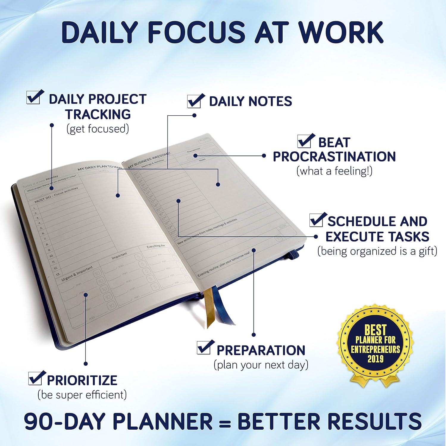 The daily planner has 2 sections. Section 1: Plan, break down and organize goals and projects and you have a full system to focus on a big project or goal in a 90-day timeframe. Section 2: Daily time management with priorities to win the day!