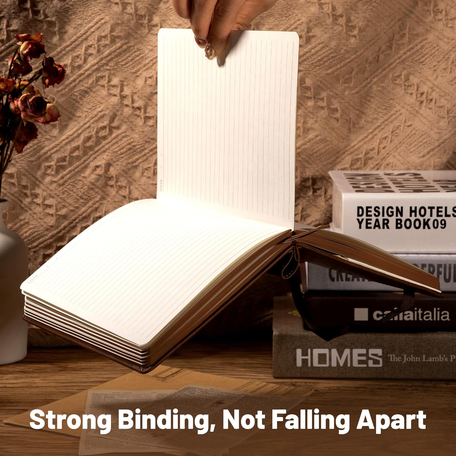 【Sturdy Binding】: Hardcover journal strong stitching process and extra layer of leather is sewn to prevent spine damage and pages falling out, The stitched leather on the spine can be used as a pen holder.
