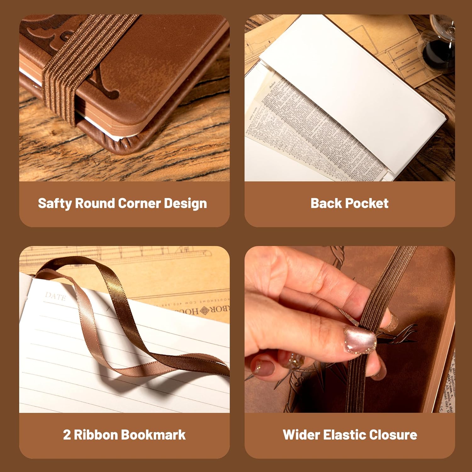 【Notebook Features】: Leather bound notebook has 2 Exquisite ribbon bookmarks to help you find content faster; 1 Elastic closure strap to keep the notebook closed; 1 leather stitched pen holder, can hold most pens; 1 Inner pocket for appointment cards, notes, receipts and more.