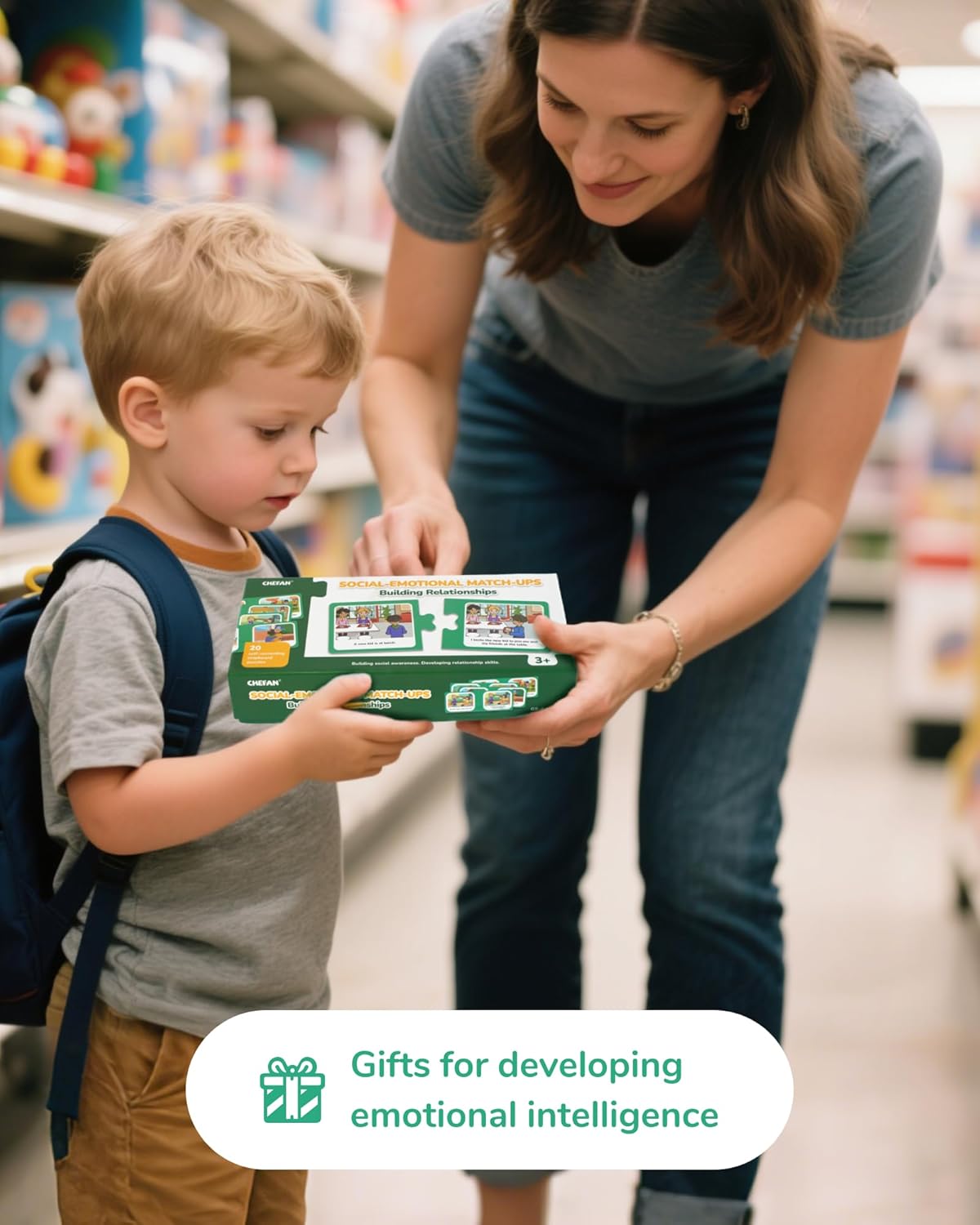 What’s in the Box – This set includes 20 durable, self-correcting two-piece puzzles that feature everyday social situations and thoughtful responses. Each pair encourages young children to recognize emotions, practice empathy, and develop social skills. ideal for ages 3+, autism learning materials, and speech therapy.