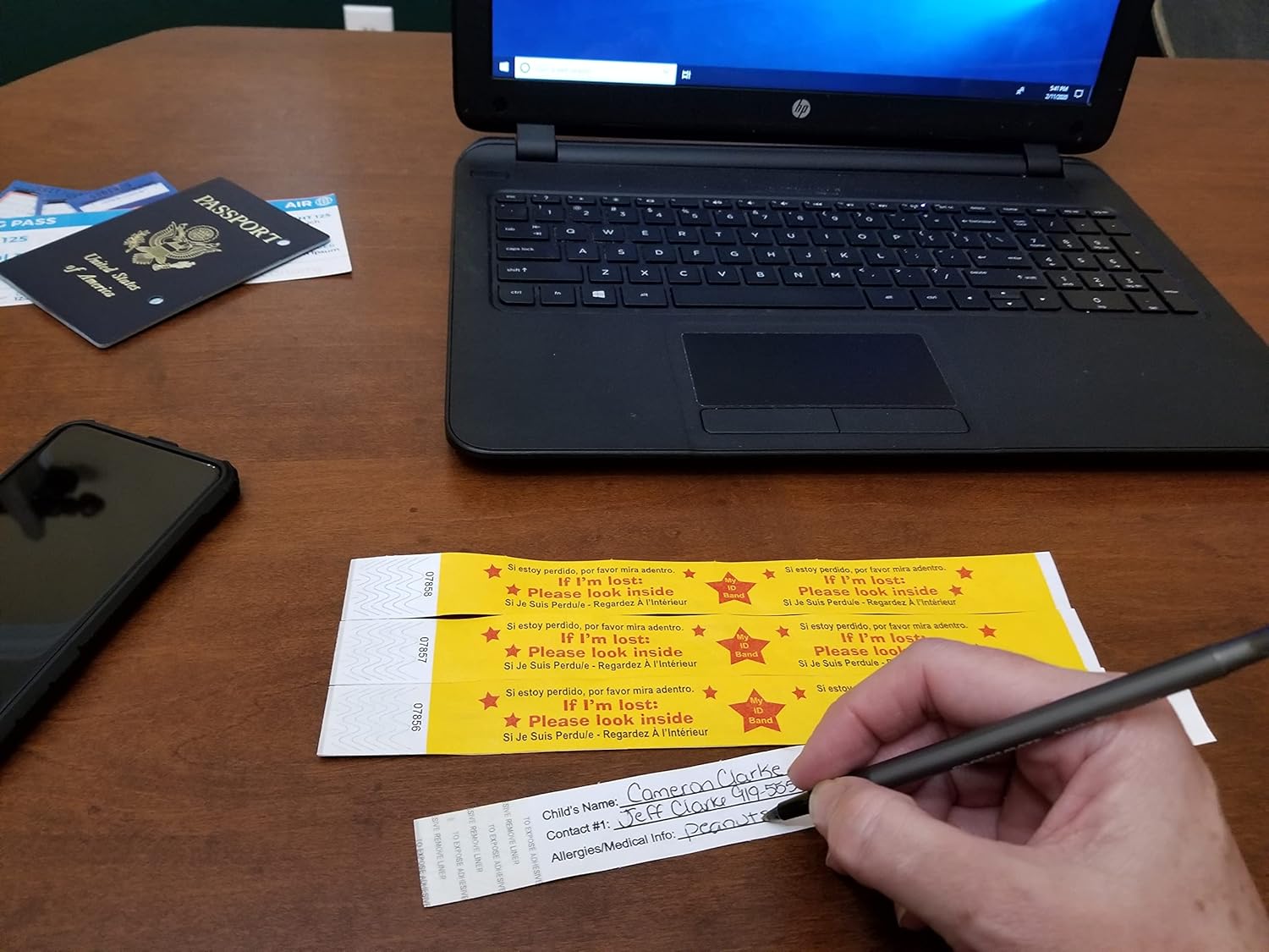 Product Specifications – 6 Pack – Waterproof and Discreet – One Size Fits All. Text on outside of the band is in English, French and Spanish. Includes fields for Child’s Name, Hotel/Flight Info, Two Contacts, and Allergies/Medical/Other.