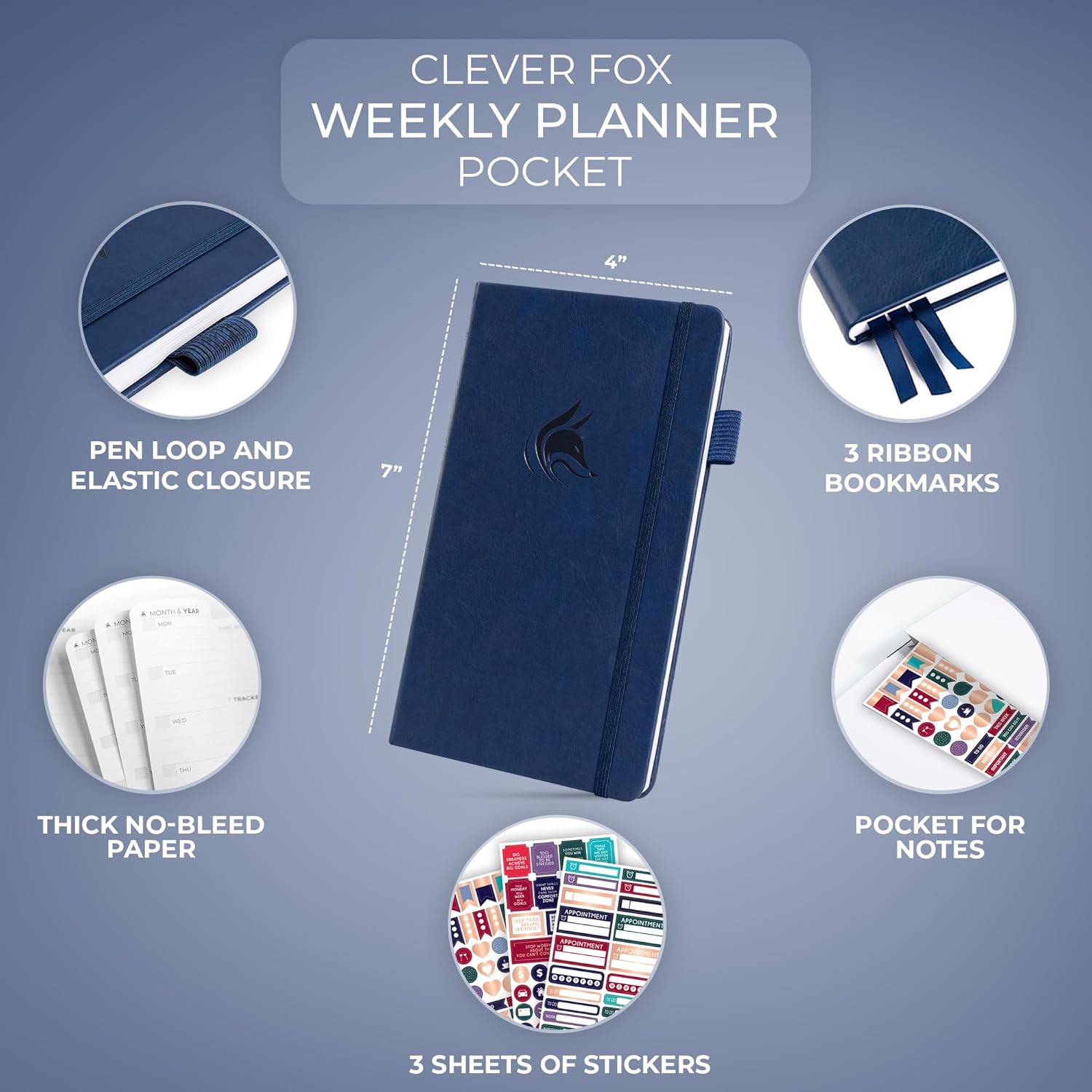 Clever Fox Pocket Planner Weekly – Undated Monthly Goal Planner and Calendar, Mini Planner Perfect for Purse, 3.7×6.7″ (Dark Blue)