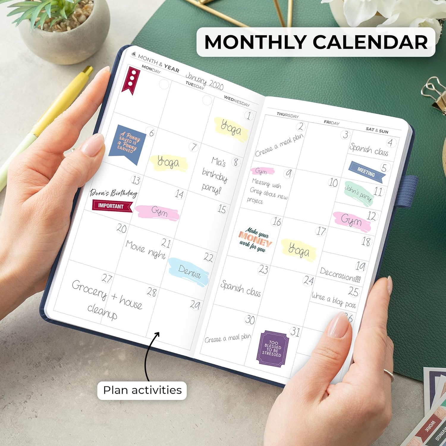 COMPLIMENTARY STICKERS & MORE – This pocket calendar planner and organizer for women and men comes with colorful planner stickers, a bookmark, elastic band, pen loop, user guide, and pocket for loose notes.