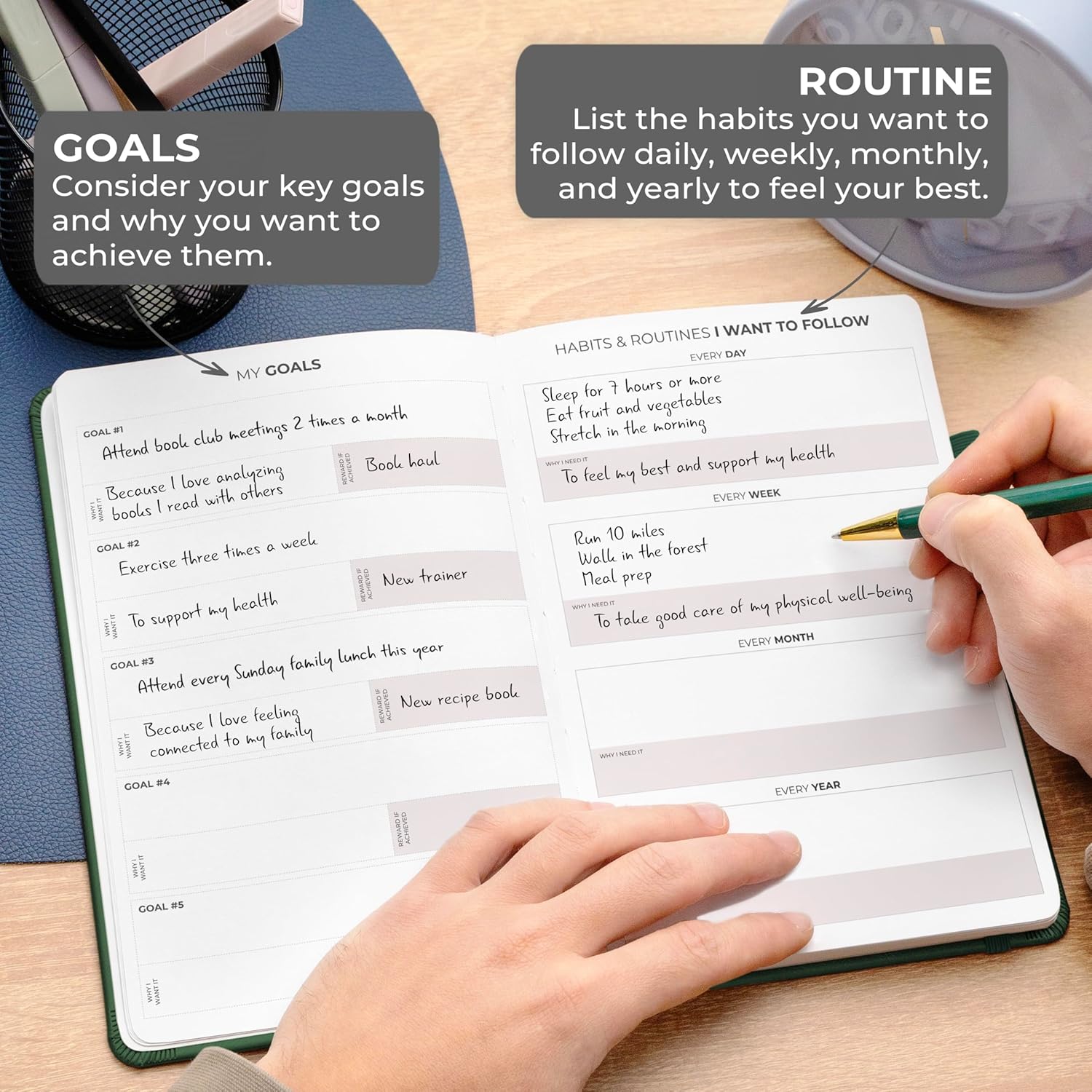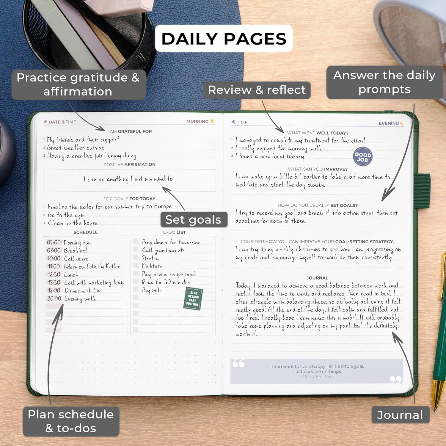 Elegant eco-leather hardcover Thick 120gsm no-bleed paper 3 bookmarks for easy navigation Elastic band & pen loop for convenience Illustrated user guide for seamless use 2 sheets of motivational stickers