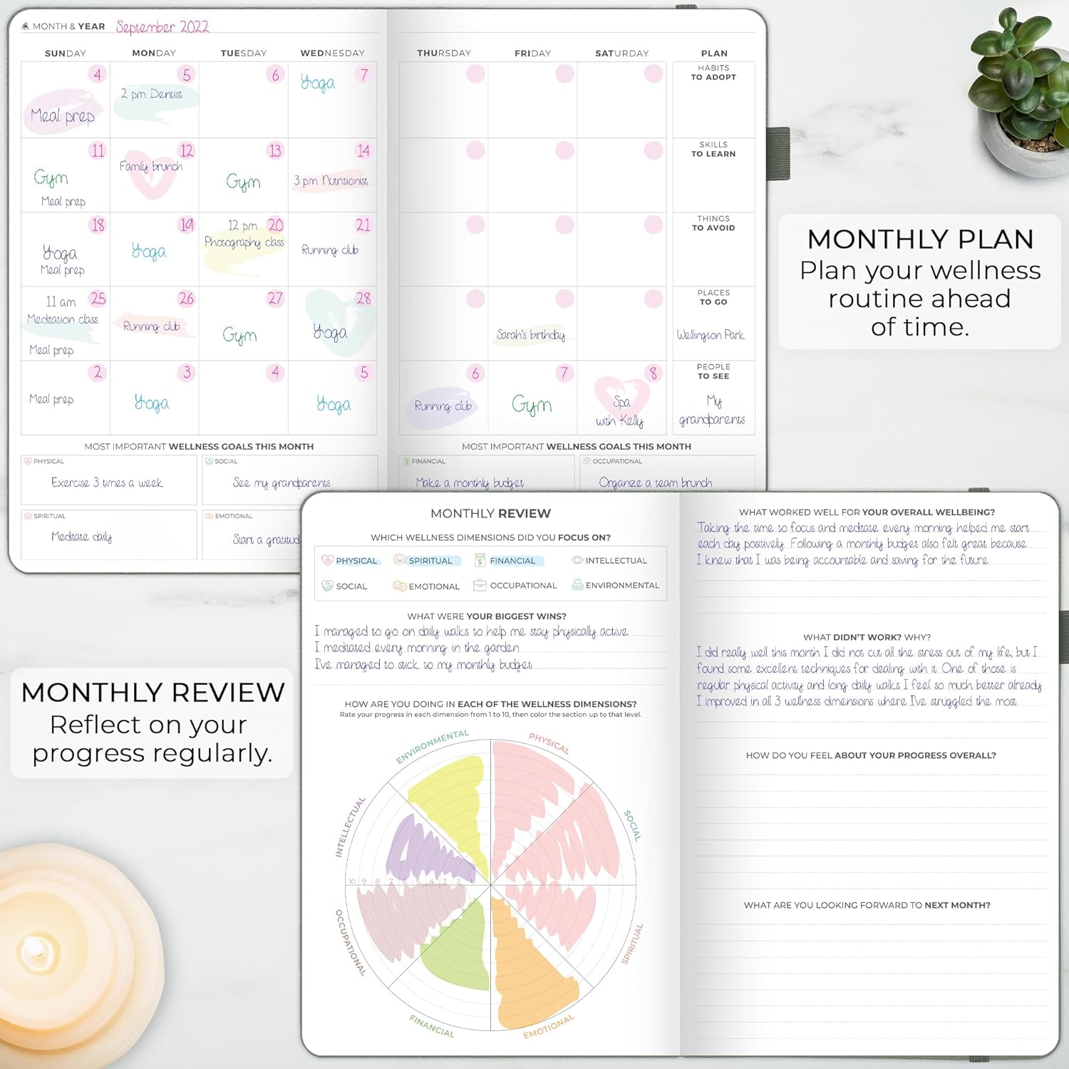 The ultimate wellness journal to assess your wellbeing, set goals, and take action daily Our basic wellness planner to set goals, plan daily, and review your progress monthly Plan your meals and workouts, and track your progress with your daily food diary Spiral-bound journal to track your workouts and fitness progress Combining all of the features of the classic food and fitness journals into one ultimate planner