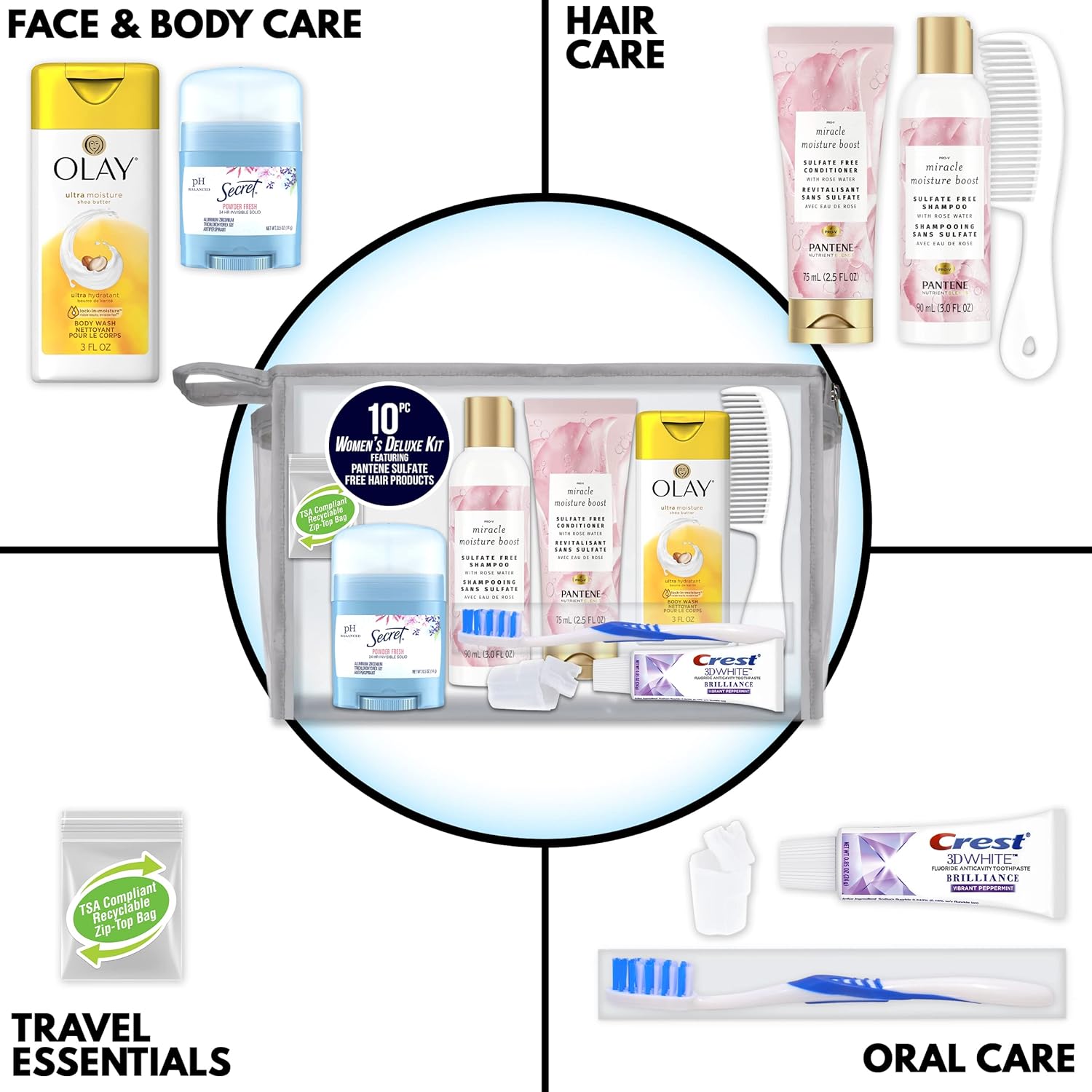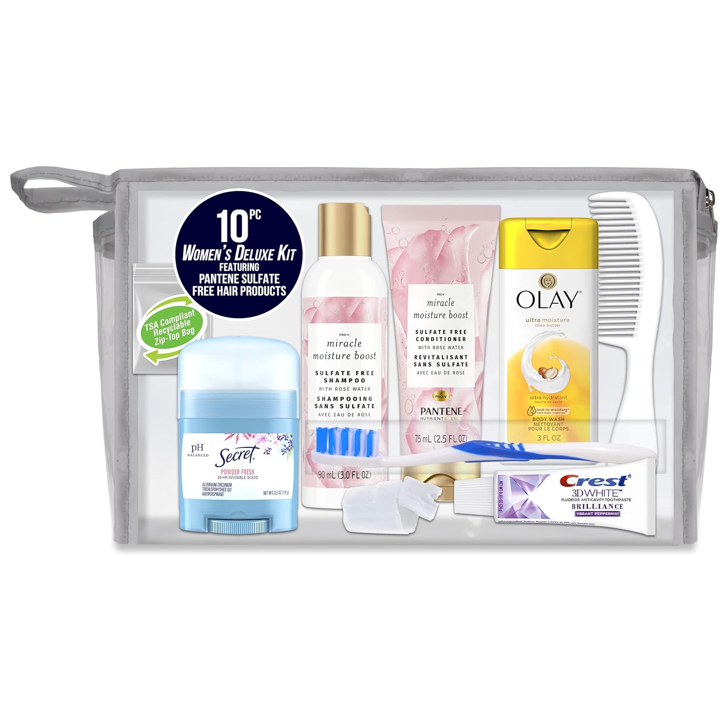10 PC Women’s Kit Contains: Hair Care: Pantene Sulfate Free Shampoo 3 oz., Pantene Sulfate Free Conditioner 2.5 oz., Styling Comb, Body Care: Olay Body Wash 3 oz., Secret A/P Deodorant .5 oz., Oral Care: Crest Toothpaste .85 oz., Adult Toothbrush, Toothbrush Cover, Travel Essentials: TSA Compliant Quart Size Zip Top Bag in Clear Front and Back Rectangular Zippered Bag with Silver Piping.