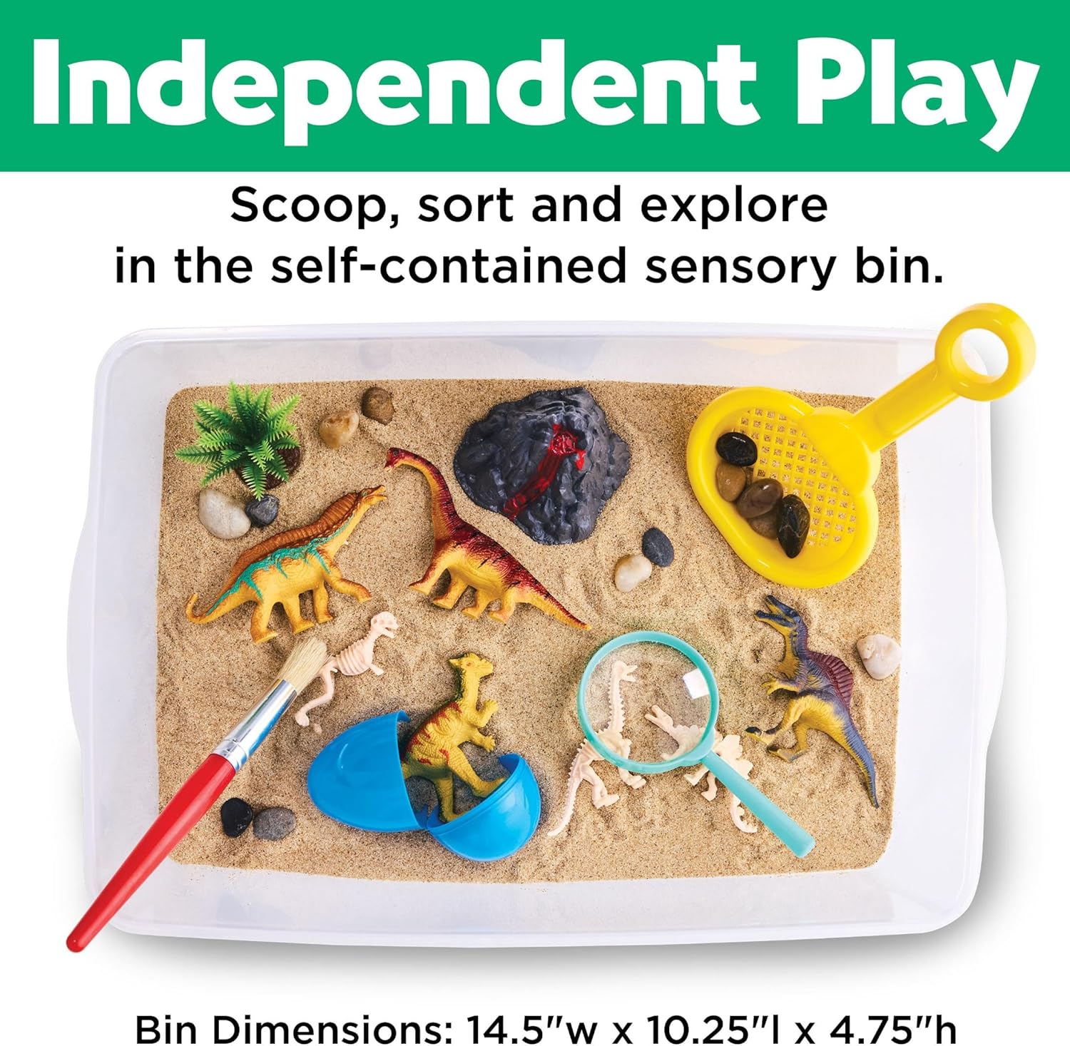 DINOSAUR SENSORY BIN: Explore prehistoric times with an ultimate pretend-play dinosaur dig sensory toy. This unique toddler activity features a sensory bin filled with 3 lb of play sand, dinosaur toys for kids 3-4+, rocks, sand sifter, fossils, volcano toy, and more! Explore your sensory bin; count and name the colors of each item, make up a story about your dig and more!