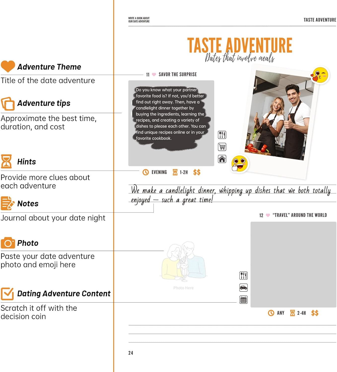 50 SCRATCH OFF DATE IDEAS: Every couple’s story deserves a biography. Chapter 1: Our date adventures so far. Chapter 2: 50 date adventures in 5 love languages. Chapter 3: Create your own date adventures. Our date idea book scratch off is a unique combination of a couples adventure book, scrapbook, and photo album