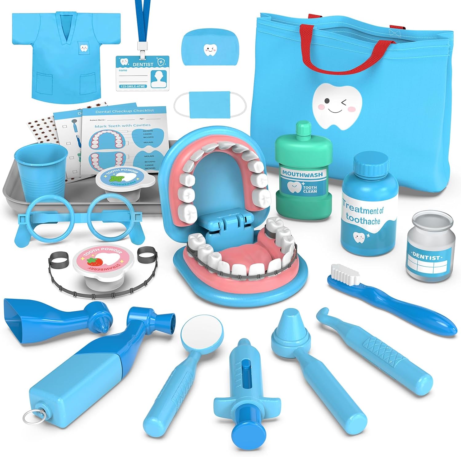 Safe, Durable, and Easy to Store: Made from high-quality ABS plastic, this dentist play set is safe and built to last. It includes a sturdy storage bag and a pretend dentist outfit, making cleanup easy and adding an extra layer of fun to the role-playing experience.