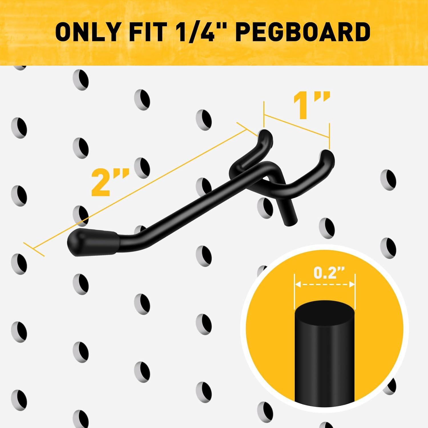 UNIVERSAL 1/4″ PEGBOARD COMPATIBILITY – With a 0.2 inch thick shaft, these hooks fit perfectly into standard 1/4″ pegboards with 1″ spacing. Compatible with both metal and non-metal boards, they stay firmly in place, even under heavy loads.