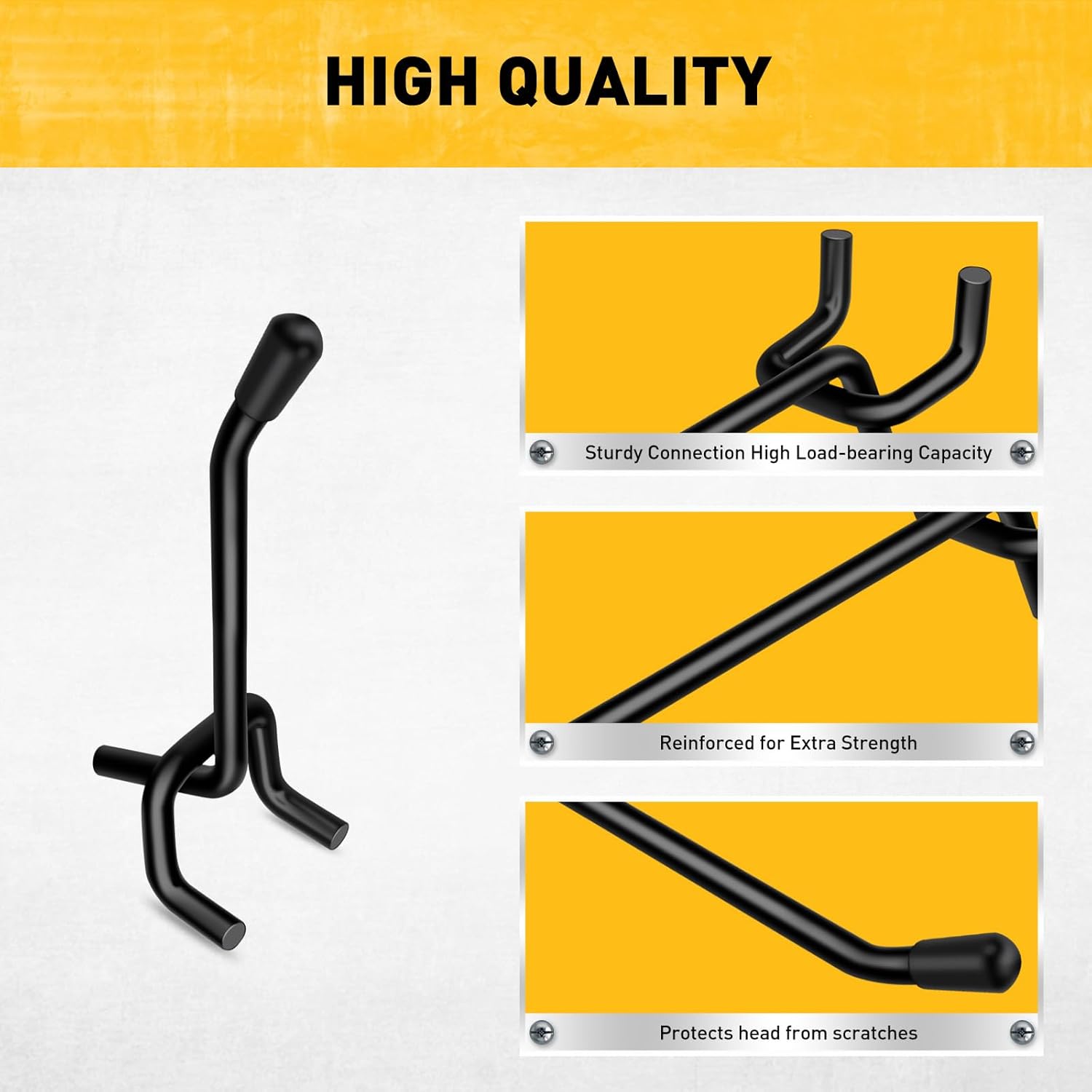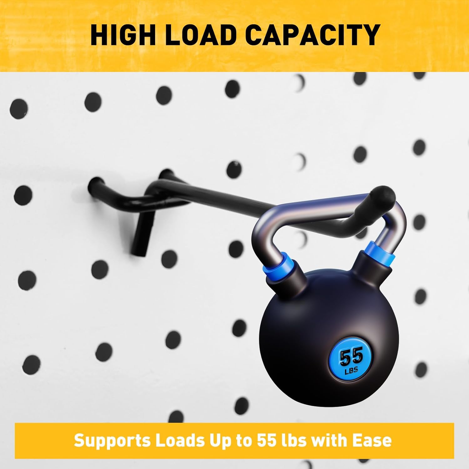 3X EXTRA THICK – Crafted from premium hardened steel with a matte black powder-coated finish, these pegboard tool hooks are 3x thicker and heavier than most competitors. Engineered for strength and corrosion resistance, each hook supports up to 55 lbs — perfect for daily heavy-duty use.