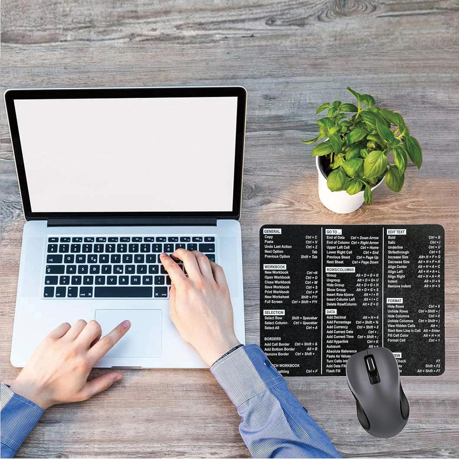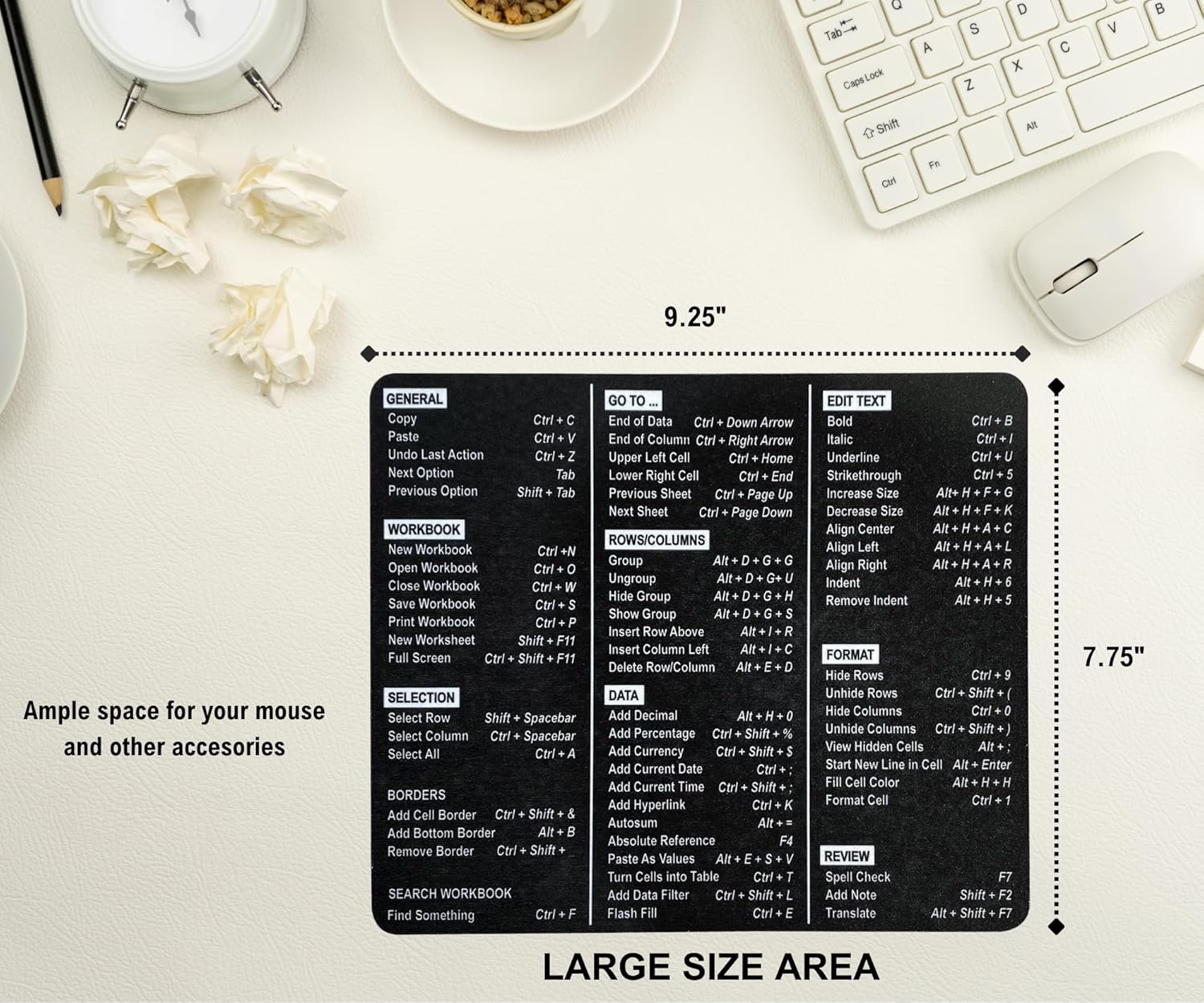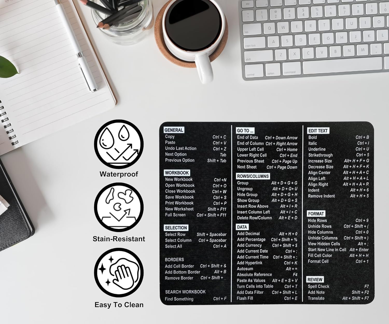 Make sure to get rid of sticky notes and lists with shortcuts. This mouse pad with Excel formulas contains most of the commonly used Excel shortcuts so whether you are a beginner or an expert, you can perform safely and confidently without losing your focus.