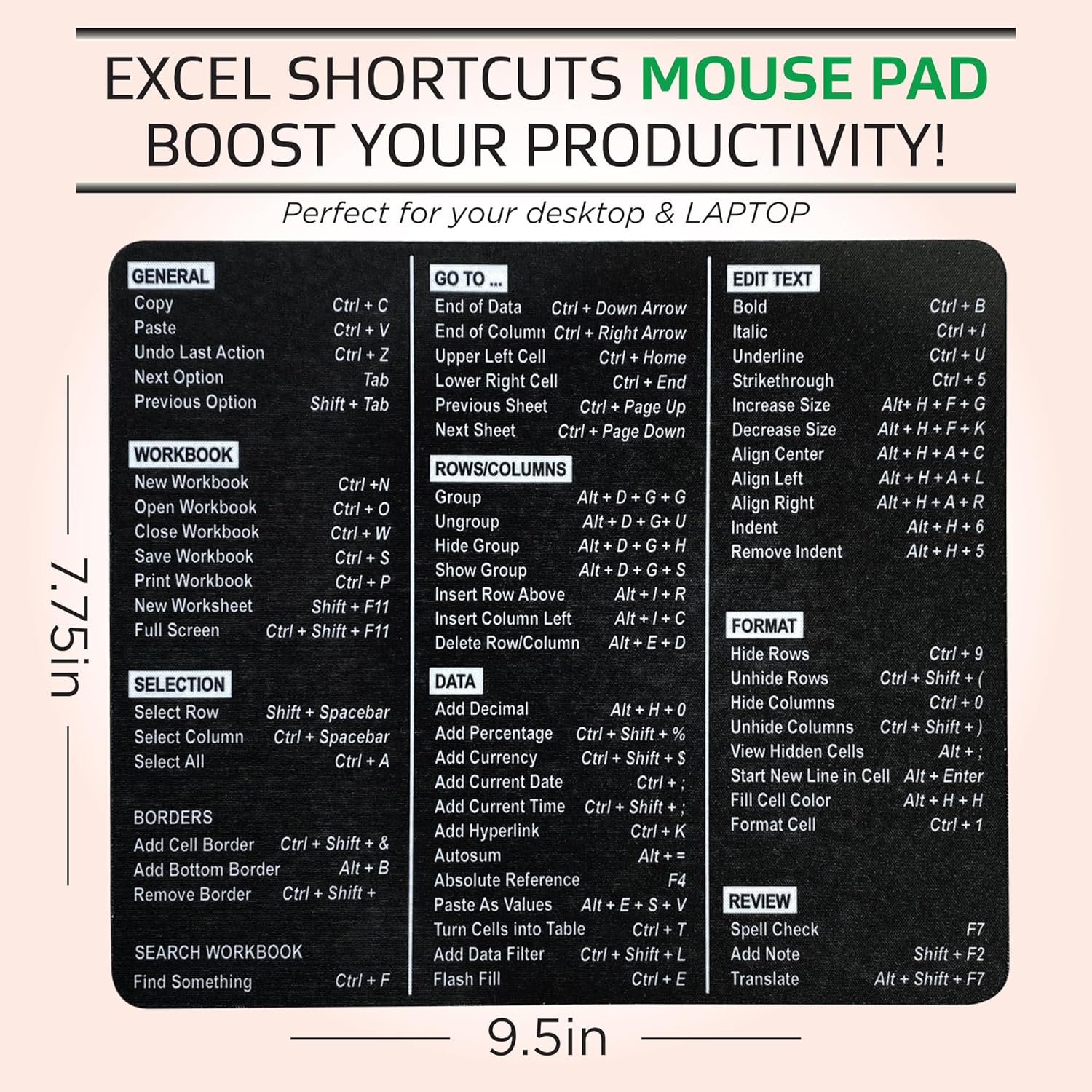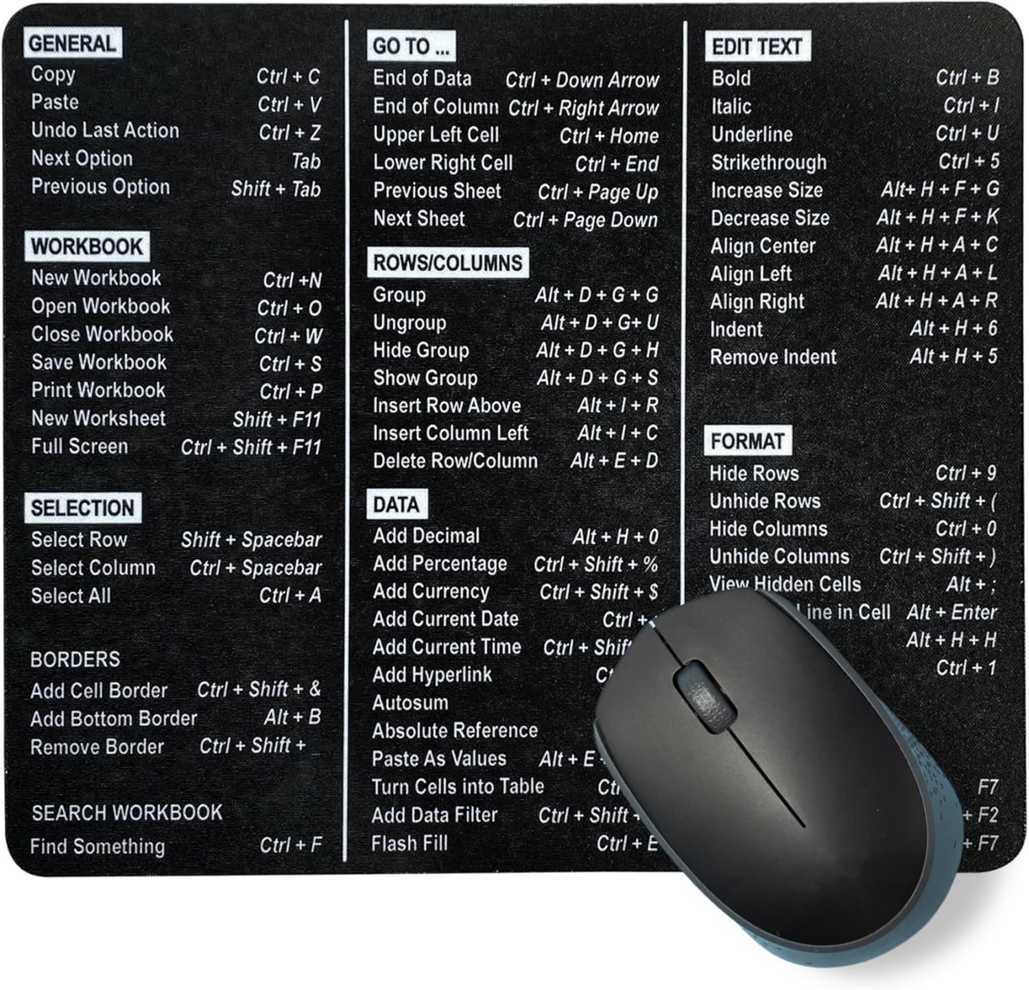 Excel Shortcuts Mouse Pad – The Ultimate Productivity Tool – Dominate Excel Like a Pro – The Secret Weapon to Master Excel – 7.75” x 9.25” Rectangular Shape (Solid Black Print)