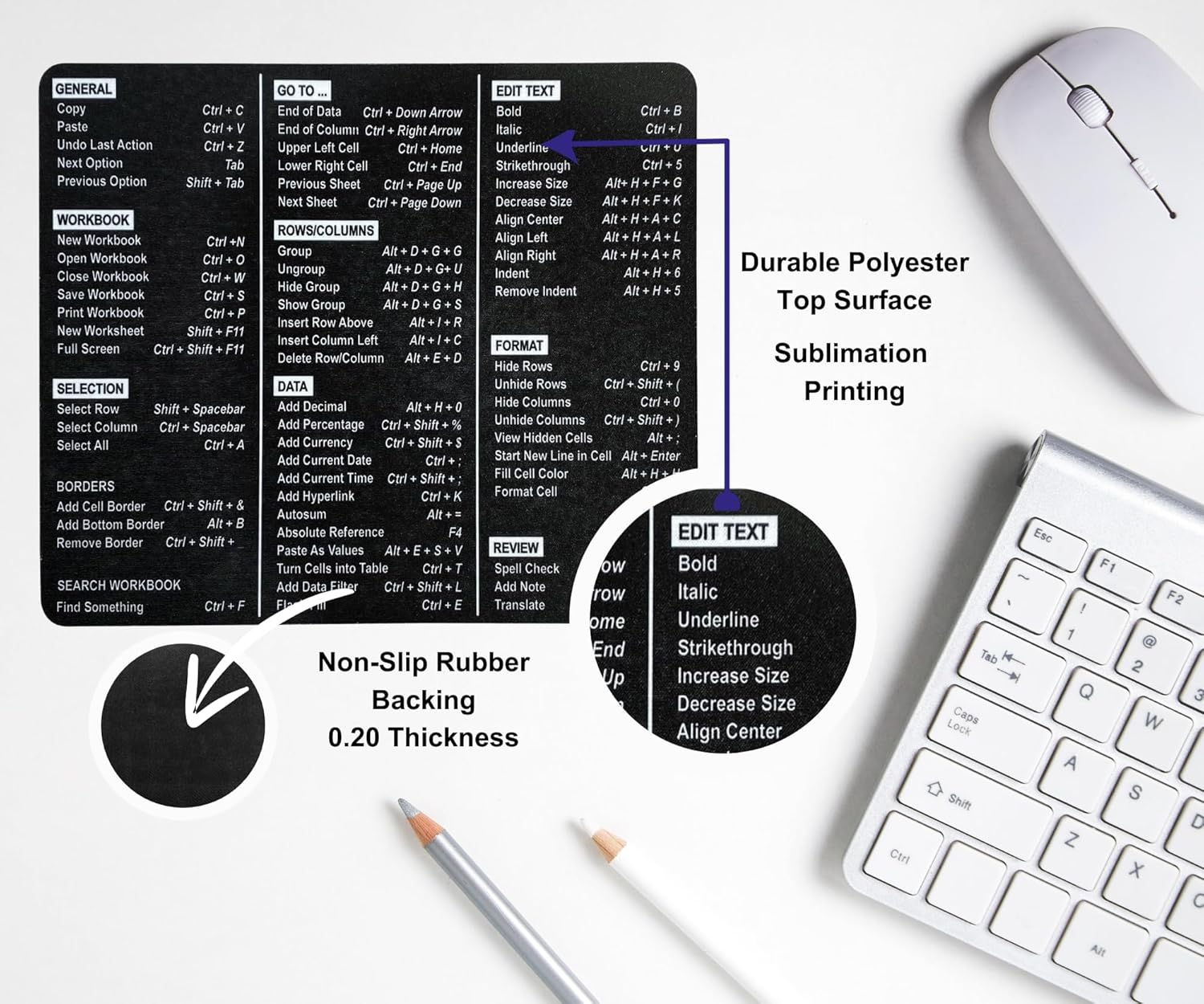 The Excel Shortcuts Mouse Pad has been specially designed to enhance your workflow. It contains 66 important Excel shortcuts that complete your daily work quickly, accurately, and intelligently so you always get things done right.