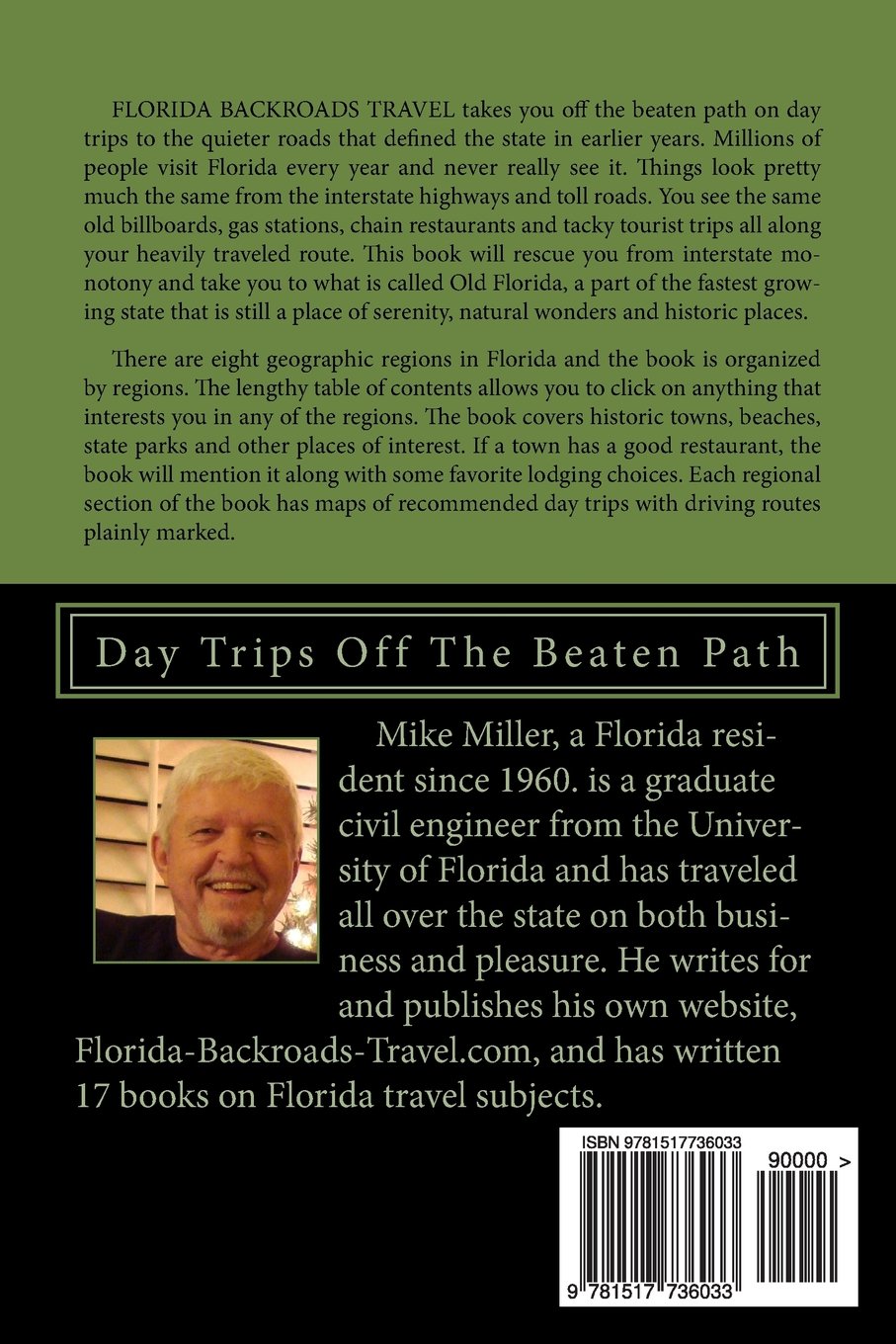 FLORIDA BACKROADS TRAVEL takes you off the beaten path on day trips to the quieter roads that defined the state in earlier years. Millions of people visit Florida every year and never really see it. Things look pretty much the same from the interstate highways and toll roads. You see the same old billboards, gas stations, chain restaurants and tacky tourist trips all along your heavily traveled route. This book will rescue you from interstate monotony and take you to what is called Old Florida, a part of the fastest growing state that is still a place of serenity, natural wonders and historic places.There are eight geographic regions in Florida and the book is organized by regions. The lengthy table of contents allows you to click on anything that interests you in any of the regions. The book covers historic towns, beaches, state parks and other places of interest. If a town has a good restaurant, the book will mention it along with some favorite lodging choices. Each regional section of the book has maps of recommended day trips with driving routes plainly marked. FLORIDA BACKROADS TRAVEL will show you where the best beaches are. You will also learn about Florida State Parks. These parks are quiet treasures that will make your visit even more interesting. The book doesn’t spend much time on the major tourist attractions like Walt Disney World, Universal Studios and SeaWorld although it gives you enough information to find your way around those places. The towns and country roads are the best attractions, along with some of the lesser known places such as Florida wineries. Many people don’t realize Florida has wineries, but it does. This book will introduce you to wineries where you can see how the wine is made and taste it on the spot.Florida heritage and history is an important part of the state culture so each section of the book has a brief regional history. The book also tells you about Florida festivals, including art shows and musical events, and gives you times and places so you can enjoy them during your visit. You will also find a list of all 1,300 Florida heritage sites divided among the individual regions.The book is written by Mike Miller, a Florida resident since 1960. Mike is a graduate civil engineer from the University of Florida and has traveled all over the state on both business and pleasure. He writes for and publishes his own website, Florida-Backroads-Travel.com and has authored 17 books on Florida travel subjects.