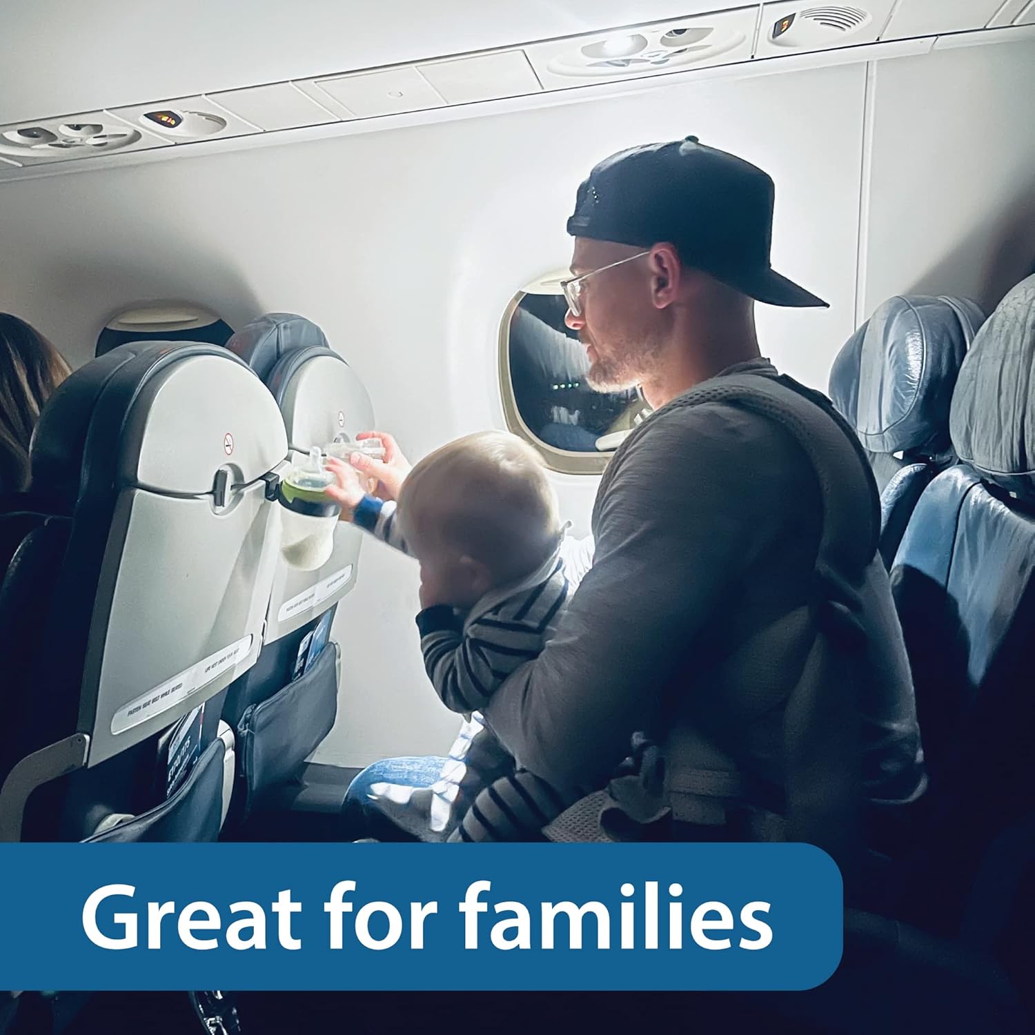 Invented for drink cups not bottles or cans. No more crushed cup in the seat pocket of airplanes, trains, or automobiles. Clip this travel gadget to hold that drink during taxi, takeoff, landing, or throughout the flight