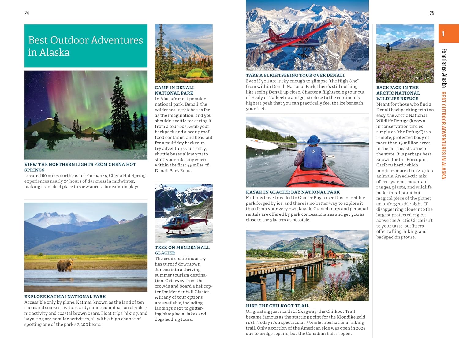 AN ILLUSTRATED ULTIMATE EXPERIENCES GUIDE to the top things to see and doMULTIPLE ITINERARIES to effectively organize your days and maximize your timeMORE THAN 30 DETAILED MAPS and a FREE PULL-OUT MAP to help you navigate confidentlyCOLOR PHOTOS throughout to spark your wanderlust!HONEST RECOMMENDATIONS FROM LOCALS on the best sights, restaurants, hotels, nightlife, shopping, performing arts, activities, side-trips, and morePHOTO-FILLED “BEST OF” FEATURES on “Alaska’s Best Outdoor Adventures”, “Alaska’s Best Wildlife Adventures”, “Alaska’s Best Shore Excursions”, and more.TRIP-PLANNING TOOLS AND PRACTICAL TIPS including when to go, getting around, beating the crowds, and saving time and moneyHISTORICAL AND CULTURAL INSIGHTS providing rich context on the local people, politics, art, architecture, cuisine, geography and moreSPECIAL FEATURES on “Alaska Cruises 101”, “Alaska’s Glaciers”, “Native Arts and Crafts”, and more.LOCAL WRITERS to help you find the under-the-radar gemsUP-TO-DATE COVERAGE ON: Juneau, Denali National Park, Anchorage, Fairbanks, the Kenai Peninsula, Skagway, Ketchikan, Glacier Bay, Haines, Homer, Kodiak Island, the Yukon, and more.