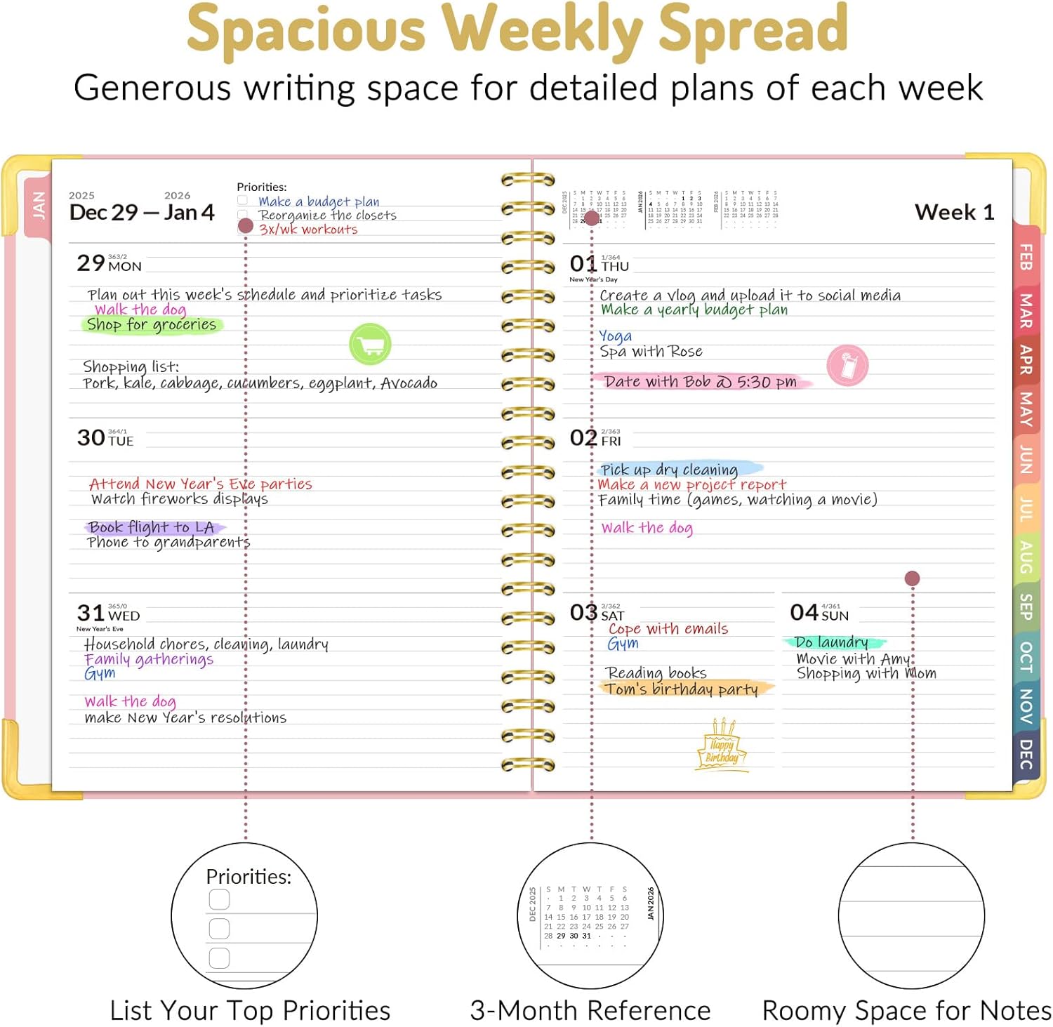 2026 Planner with Simple Layout: Come with 12 months (Jan 2026 – Dec 2026) of monthly and weekly pages, providing a fresh start for an entire year! This calendar planner features a simplified layout for ease of use, offering spacious writing space to plan your schedule. The elegant design with attention-grabbing colors, adds a touch of sophistication to any setting!