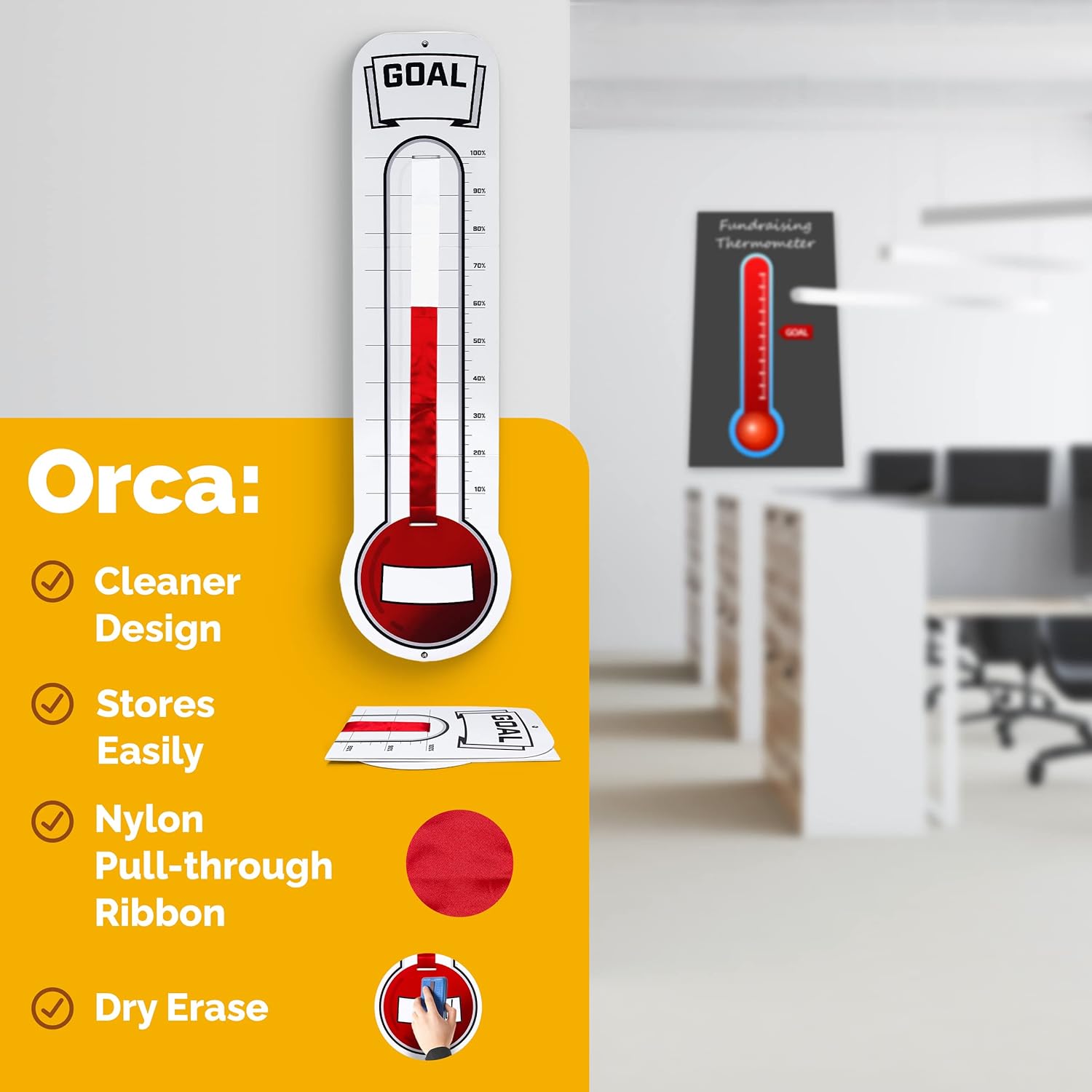 Fundraising Thermometer Chart Goal Tracker | Dry Erase Goal Setting Wall Mounted Thermometer | Giant Sales Goal Board with Pull-Through Ribbon Progress Tracker (46” x 12”) by ORCA