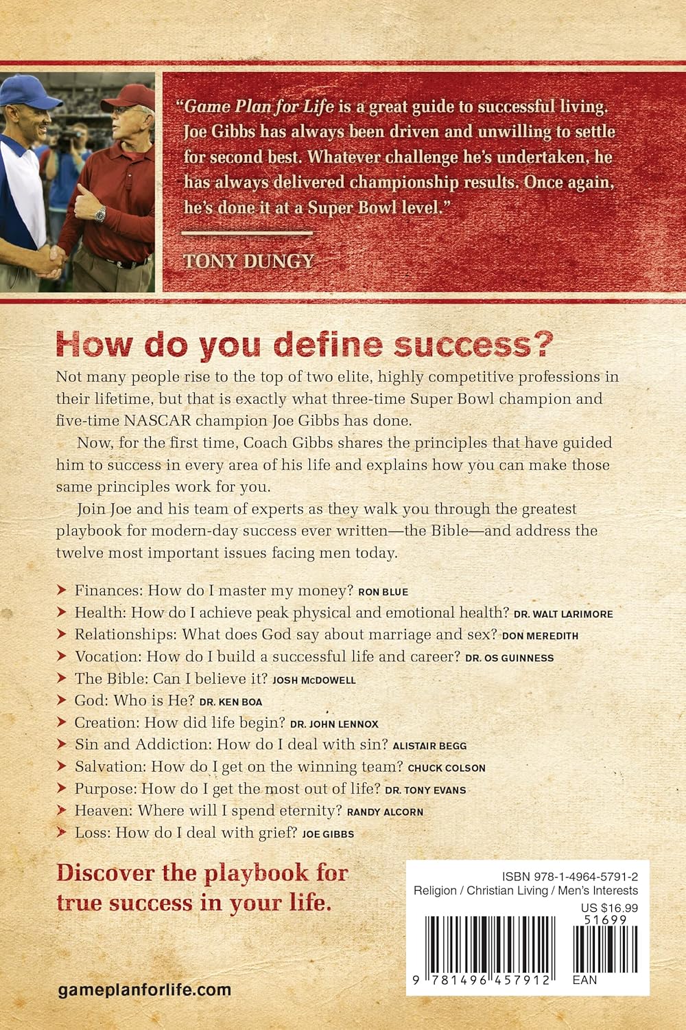 Now, for the first time, Coach Gibbs shares the principles that have guided him to success in every area of his life and explains how you can make those same principles work for you. Join Joe and his team of experts as they walk you through the greatest playbook for modern-day success ever written―the Bible―and address the twelve most important issues facing men today.Finances: How do I master my money? Ron BlueHealth: How do I achieve peak physical and emotional health? Dr. Walt LarimoreRelationships: What does God say about marriage and sex? Don MeredithVocation: How do I build a successful life and career? Dr. Os GuinnessThe Bible: Can I believe it? Josh McdowellGod: Who is He? Dr. Ken BoaCreation: How did life begin? Dr. John LennoxSin and Addiction: How do I deal with sin? Alistair BeggSalvation: How do I get on the winning team? Chuck ColsonPurpose: How do I get the most out of life? Dr. Tony EvansHeaven: Where will I spend eternity? Randy AlcornLoss: How do I deal with grief? Joe GibbsDiscover the Playbook for true success in your life.