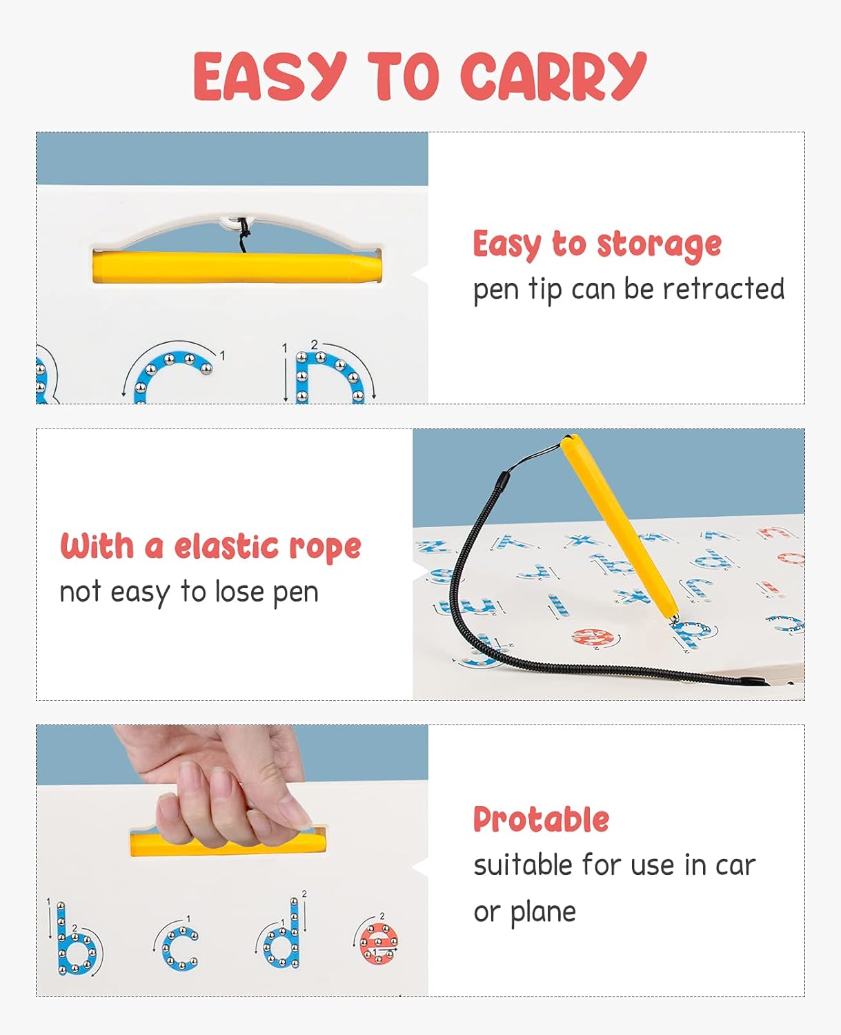 Great Tool to Teach Writing: Children using the stylus pen help them stay on the stroke – and they love to hear and see the metal beads pop up as they go. Then they can use their finger to erase each letter. With the sequence stroke and path direction instruction guide next to each alphabet character