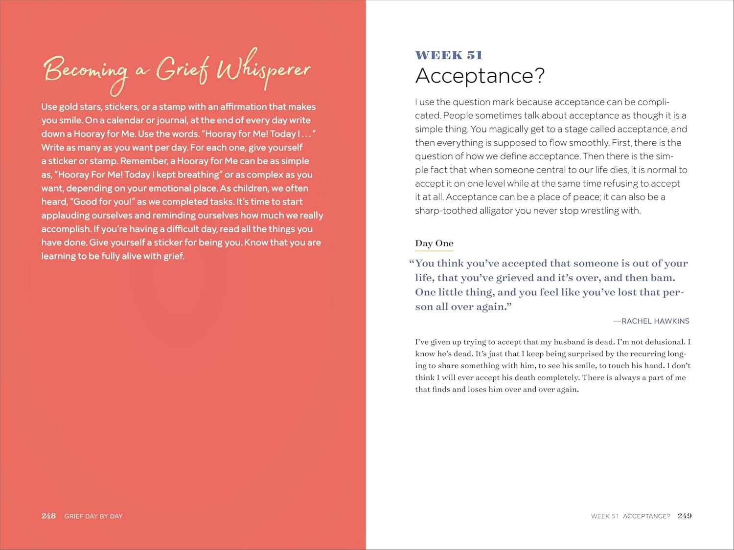 Customers find this grief book helpful and well-written, with one noting it’s broken down into 52 chapters/weeks. They appreciate how it deals with all feelings and provides meaningful quotes, while one customer mentions it covers all types of losses. The book offers guidance throughout the grieving journey, with one review highlighting its comprehensive coverage of themes throughout the year. Customers value the support it provides, with one describing it as an amazing guide for their grief recovery journey.