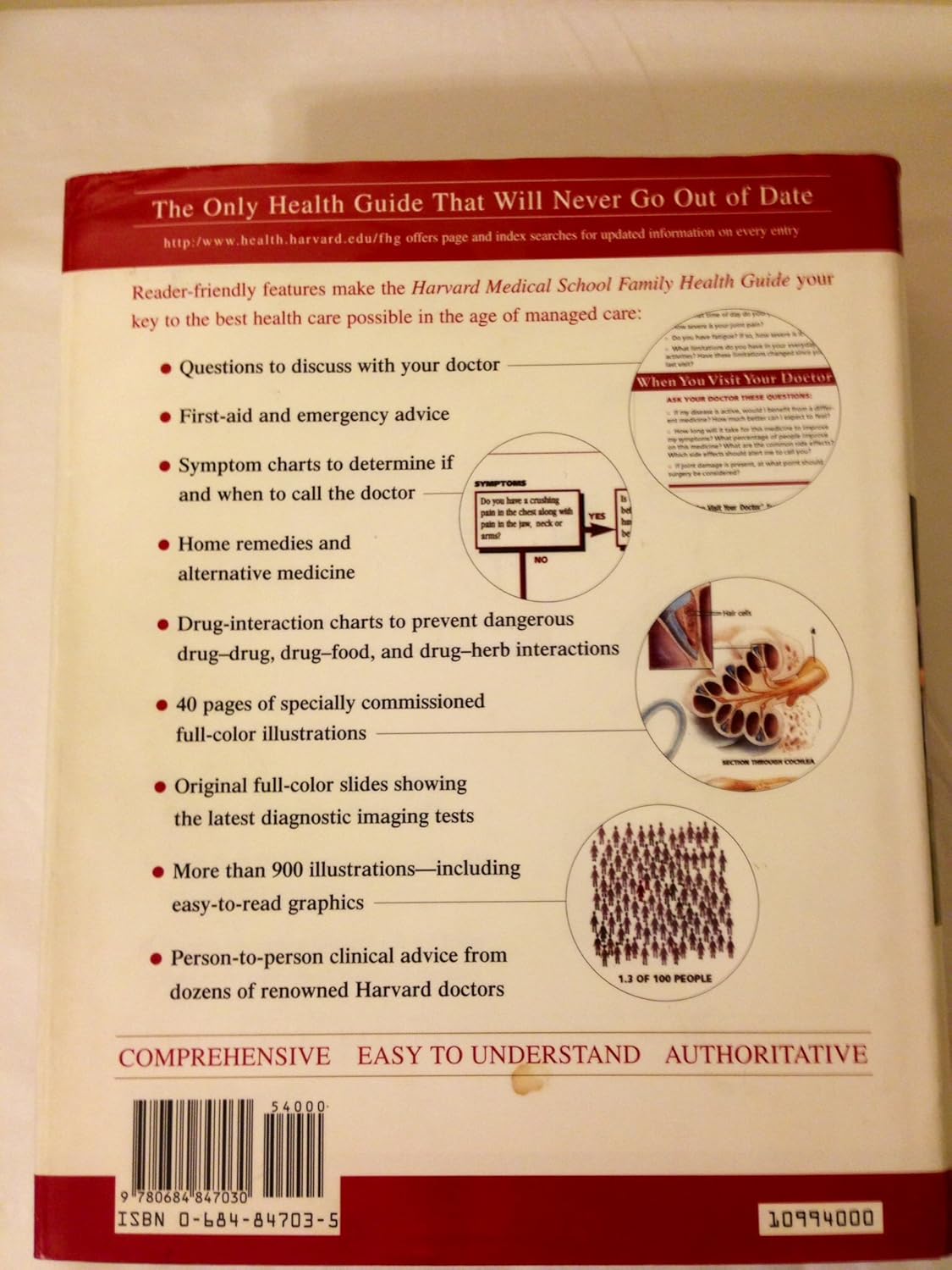 The first health guide for the era of managed care is also the only one that will never go out of date. www.health.harvard.edu/fhg offers page and index searches for updated information on every entry. Today we all have a better chance of living a longer, healthier life than ever before — but only if we know how to utilize the advances in medicine science has given us. Whether you depend on traditional fee-for-service health care or some form of managed care, you must make health decisions in partnership with doctors…doctors with whom you may only spend a few minutes. How can you sort out the confusing, often contradictory health information that is bombarding you daily and communicate clearly and effectively with your doctor? How can you gain access to the best care and evaluate the care you are getting? The Harvard Medical School Family Health Guide answers these essential questions and many more. The first health guide written specifically to empower readers in the era of managed care, it is the culmination of 200 years of clinical care, health education, and medical research — bringing you the expertise of more than 7,000 health professionals from some of the nation’s most esteemed hospitals and research centers. In this book, they have gathered the most authoritative, comprehensive, easy-to-understand, up-to-the-minute information about the diagnosis, treatment, and prevention of disease in every stage of life to help you: Make the most of the time you spend with your doctor. Decide when and if you need to see a doctor. Avoid dangerous drug interactions. Explore alternative treatments safely. Choose wisely among treatment options. Access emergency and other important information easily. Learn the most effective ways to prevent disease. Consult with the most renowned doctors in America, including Herbert Benson, T. Berry Brazelton, Robert Coles, and Richard Ferber. Receive the most current information from our Web site, which gives you free online updates. Harvard Medical School consists of world-renowned affiliated hospitals, clinics, and research foundations, which include: