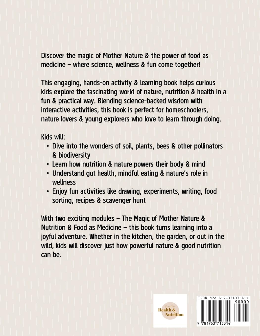 This book is more than just an activity guide — it is a holistic wellness toolkit that empowers kids with the knowledge to take care of their bodies and the planet.